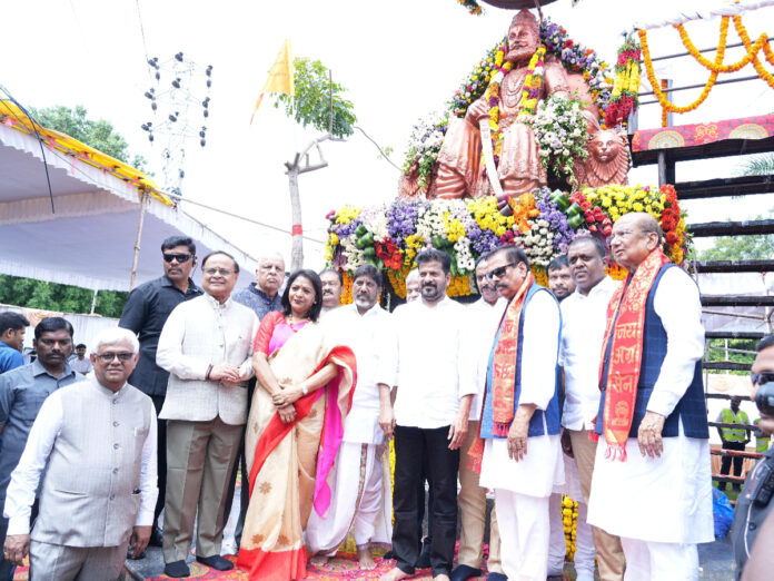కాకతీయ, తెలంగాణ బ్యూరో: మహారాజా శ్రీ అగ్రసేన్ జయంతి 5149వ వేడుకల్లో తెలంగాణ ముఖ్యమంత్రి రేవంత్ రెడ్డి, ఉప ముఖ్యమంత్రి శ్రీ భట్టి విక్రమార్క పాల్గొన్నారు. ఈ సందర్భంగా మహారాజా శ్రీ అగ్రసేన్ విగ్రహానికి పూలమాలలు వేసి నివాళులు అర్పించారు. సమాజహితానికి, సమానత్వానికి కష్టపడిన మహారాజా అగ్రసేన్ ఆలోచనలను స్మరించుకుంటూ, సామాజిక న్యాయం, సహజీవన సౌహార్ద్రం కోసం కృషి చేయడం ప్రతి ఒక్కరి బాధ్యత అని డిప్యూటీ సీఎం పేర్కొన్నారు.