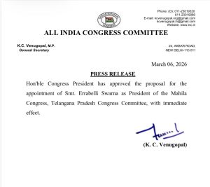 కాకతీయ, తెలంగాణ బ్యూరో / వరంగల్ బ్యూరో : తెలంగాణ కాంగ్రెస్ రాజకీయాల్లో అనూహ్యమైన పరిణామం చోటుచేసుకుంది. రాష్ట్ర మహిళా కాంగ్రెస్ అధ్యక్షురాలిగా వరంగల్‌కు చెందిన ఎర్రబెల్లి స్వర్ణను నియమిస్తూ పార్టీ అధిష్ఠానం అధికారికంగా ప్రకటించింది. ఈ మేరకు ఆల్ ఇండియా కాంగ్రెస్ కమిటీ ప్రధాన కార్యదర్శి కె సి వేణుగోపాల్ ప్రకటన విడుదల చేశారు. కాంగ్రెస్ పార్టీ జాతీయ అధ్యక్షుడు ఈ నియామకానికి ఆమోదం తెలిపినట్లు వెల్లడించారు. ఈ నిర్ణయం వెంటనే అమల్లోకి వస్తుందని పార్టీ వర్గాలు పేర్కొన్నాయి. వరంగల్ తూర్పు నియోజకవర్గంలో ఇటీవలి కాలంలో నెలకొన్న రాజకీయ పరిస్థితుల మధ్య ఈ నియామకం రావడం జిల్లాలో పెద్ద చర్చకు దారితీసింది. నిన్నటి వరకు పార్టీ కార్యక్రమాల్లో ఆమెకు పెద్దగా ప్రాధాన్యం లేదనే ప్రచారం సాగుతుండగా ఒక్కసారిగా రాష్ట్ర స్థాయి కీలక పదవి దక్కడం రాజకీయ వర్గాలను ఆశ్చర్యానికి గురిచేసింది. కాంగ్రెస్ పార్టీలో మహిళలకు మరింత ప్రాధాన్యం కల్పించాలన్న ఉద్దేశంతోనే ఈ నిర్ణయం తీసుకున్నట్లు పార్టీ నాయకులు చెబుతున్నారు. ఎర్రబెల్లి స్వర్ణకు ఉన్న రాజకీయ అనుభవం, పార్టీ పట్ల ఉన్న నిబద్ధతను దృష్టిలో పెట్టుకుని ఆమెకు ఈ బాధ్యతలను అప్పగించినట్లు పార్టీ వర్గాలు పేర్కొంటున్నాయి. దీని ద్వారా రాష్ట్ర వ్యాప్తంగా మహిళా కాంగ్రెస్ కార్యకలాపాలకు కొత్త ఉత్సాహం వస్తుందని పార్టీ నాయకులు భావిస్తున్నారు.