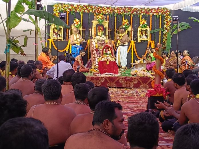 కాకతీయ ,హుజురాబాద్ : కరీంనగర్ జిల్లా హుజురాబాద్ మండలంలోని పరకాల క్రాస్‌ సమీపం వరంగల్ రోడ్డులో గల వాసవి ఇండస్ట్రీస్‌ (ఎం.ఆర్.ఎం) ప్రాంగణంలో ఆదివారం మహా దివ్య పడిపూజ, స్వాములకు భిక్ష కార్యక్రమాన్ని ఘనంగా నిర్వహించారు. ప్రముఖ రైస్‌ మిల్లు వ్యాపారులు కాళ్ళ బసవయ్య కుమారుడు కాళ్ళ సంతోష్, అనిమ దంపతులు స్వంత ఖర్చుతో ఈ కార్యక్రమాన్ని అంగరంగ వైభవంగా నిర్వహించారు. కల్లూరు వెంకట్రావు, కన్నన్ దురై రాజ్ గురు స్వాముల ఆధ్వర్యంలో పేద పండితుల మంత్రోచ్ఛారణల మధ్య సాగిన ఈ పూజ వేడుకల్లో పట్టణం, గ్రామీణ ప్రాంతాల నుంచి అయ్యప్ప మాల ధరించిన సుమారు 500 మంది స్వాములు, 200 మంది నానుస్వాములు పాల్గొన్నారు. ఉదయం నుండి మధ్యాహ్నం వరకు పెద్ద ఎత్తున పూజా కార్యక్రమాలు నిర్వహించగా ఆవరణమంతా అయ్యప్ప స్వామి శరణు ఘోషతో మారు మ్రోగింది. పట్టణానికి చెందిన పలువురు ప్రముఖులు, రైస్ మిల్ వ్యాపారులు, ఆడితి వ్యాపారులు, కిరాణా వర్తక సంఘం నాయకులు, వ్యాపారులు, మహిళలు పెద్ద ఎత్తున పాల్గొని భక్తిశ్రద్ధలతో స్వామివారిని ఆరాధించారు. హుజురాబాద్ శివరామకృష్ణ, రామానంద భజన మండలిల ఆధ్వర్యంలో భజన–కీర్తనలు నిర్వహించగా ఆ ప్రాంతమంతా భక్తి వాతావరణం నెలకొంది. సంతోష్ కుమార్ పడి అందించగా ఒక్కసారిగా స్వాములు లేచి స్వామియే శరణమయ్యప్ప అంటూ కొలిచారు. అనంతరం భిక్ష, తీర్థప్రసాదాలు అందజేసి పాదాభివందనం చేసుకున్నారు. ఈ కార్యక్రమం ఈ ఏడాది హుజురాబాద్ పట్టణంలోనే మొట్టమొదటిసారిగా పెద్ద పడిపూజ నిర్వహించినట్లుగా చర్చించుకుంటున్నారు.