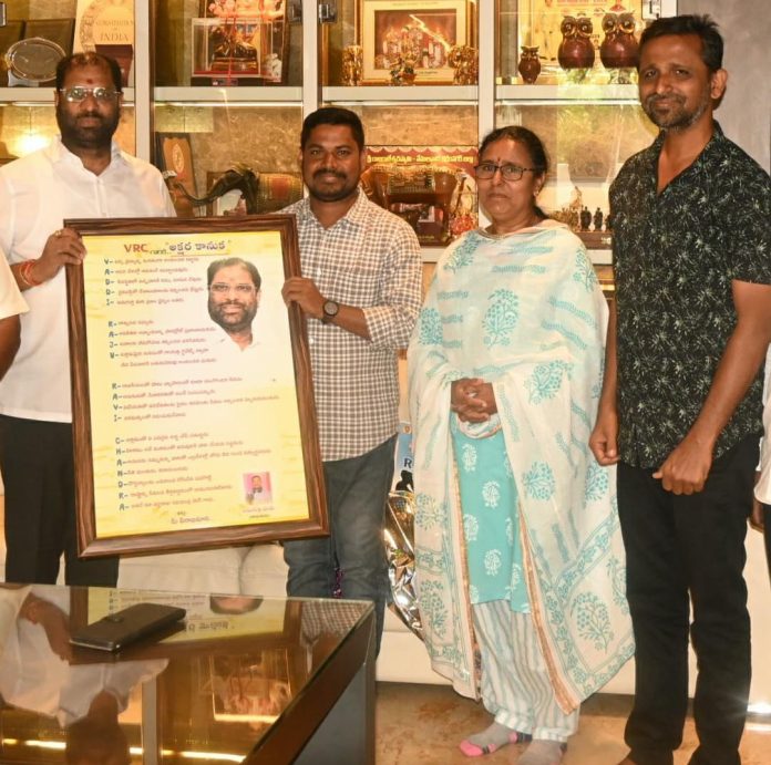 కాకతీయ, ఇనుగుర్తి : బీఆర్ఎస్ పార్టీ రాజ్యసభ సభ్యులు వద్దిరాజు రవిచంద్రకు స్వగ్రామం మహబూబాబాద్ జిల్లా ఇనుగుర్తి వాస్తవ్యుడు, ప్రముఖ గాయకుడు,చిరకాల అభిమాని ఓరుగంటి మధు (ఇనుగుర్తి)”అక్షర కానుక”ను బహుకరించారు.సుప్రసిద్ధ గాయకురాలు అరుణోదయ విమలక్క,సౌండ్ ఇంజనీర్ రవితో పాటు ఎంపీ రవిచంద్రను కలిసి ఈ “అక్షర కానుక”ను బహుకరించారు.వద్దిరాజు రవిచంద్ర పేరులో ఉన్న అర్థాన్ని,ఆయన వ్యక్తిత్వాన్ని, గొప్పతనాన్ని వివరిస్తూ ఈ “అక్షర కానుక”ను ఫోటోతో పాటు ఫ్రేం కట్టించి విమలక్క ద్వారా మధు అందజేశారు.అలాగే,మధు త్వరలో ఎంపీ రవిచంద్ర ఆశీస్సులతో వీఆర్సీ పేరుతో హన్మకొండ సుబేదారిలో తాను నెలకొల్పనున్న రికార్డింగ్ స్టూడియో,డీజే సౌండ్స్ బ్రోచర్ ను ఆయన చేతుల మీదుగా ఆవిష్కరింపజేశారు.ఈ సందర్భంగా మధును ఎంపీ వద్దిరాజు అభినందించి తన ఆశీస్సులు అందజేశారు.