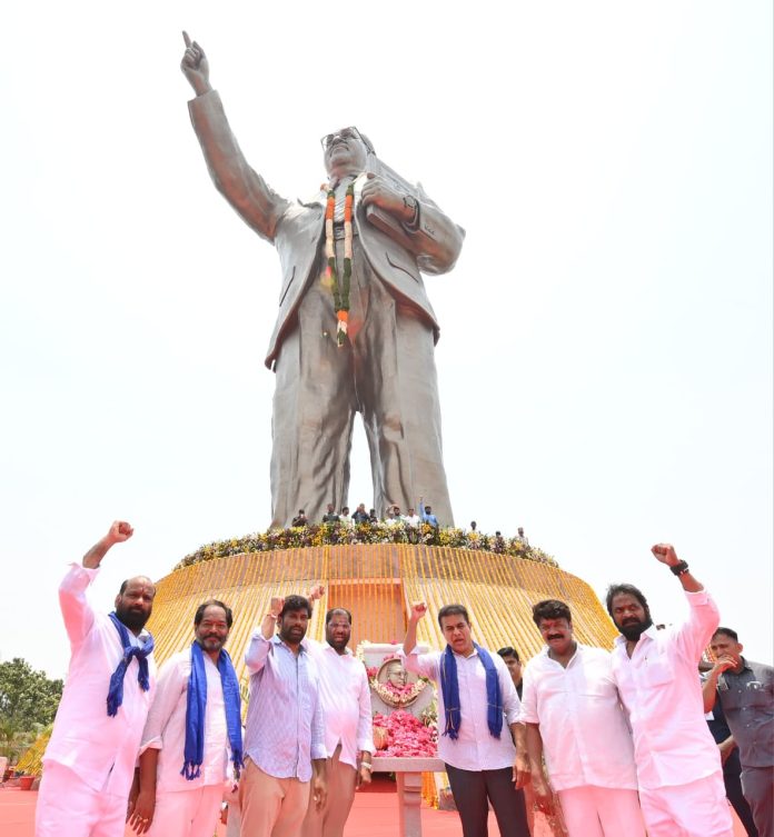 బీఆర్ఎస్ కార్యాలయంలో అంబేడ్కర్ జయంతి వేడుకలు ఘనంగా నిర్వహించారు. ఈ సందర్భంగా కేటీఆర్ మాట్లాడుతూ.. బీఆర్‌ఎస్ అధినేత కేసీఆర్ తెలంగాణ రాష్ట్ర సాధన కోసం అంబేద్కర్‌ మార్గాన్నే అనుసరించారని కేటీఆర్‌ చెప్పారు. ‘బోధించు.. సమీకరించు.. పోరాడు’ అనే అంబేద్కర్‌ తత్వాన్ని అనుసరించి.. కేసీఆర్‌ తెలంగాణ ప్రత్యేక రాష్ట్ర ఆవశ్యకతను ప్రజలకు బోధించారని, అందుకోసం లక్షల మందిని సమీకరించారని, అందరినీ కలుపుకుని పోరాడి తెలంగాణ ప్రత్యేక రాష్ట్ర కలను సాకారం చేశారని గుర్తుచేశారు. పోరాడితే పోయేదేమీ లేదన్న శ్రీశ్రీ చెప్పిన మాట నిజం అయిందని.. ప్రపంచంలోనే అతిపెద్ద అంబేడ్కర్ విగ్రహాన్ని కేసీఆర్ ఏర్పాటు చేశారని తెలిపారు. అయితే కాంగ్రెస్ ప్రభుత్వం 125 అడుగుల అంబేడ్కర్ విగ్రహానికి సంకెళ్లు వేసి బందీ చేసిందని ఆరోపించారు. ఈసారి బందీ చేస్తే సంకెళ్లు బద్దలు కొడతామని పిలుపు ఇచ్చిన వెంటనే విగ్రహాన్ని ఓపెన్ చేశారని వ్యాఖ్యానించారు.