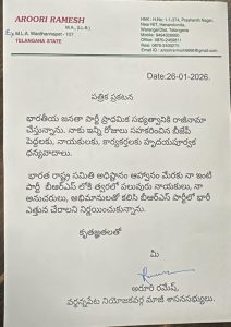 కాకతీయ, తెలంగాణ బ్యూరో: వర్ధన్నపేట మాజీ ఎమ్మెల్యే ఆరూరి రమేష్ రాజకీయ ప్రయాణం మరో కీలక మలుపు తిరిగింది. తాజాగా ఆయన భారతీయ జనతా పార్టీ సభ్యత్వానికి రాజీనామా చేసి, తిరిగి *భారత రాష్ట్ర సమితి*లో చేరాలని నిర్ణయించుకున్నట్లు సమాచారం. ఎల్లుండి (జనవరి 28) అధికారికంగా బీఆర్ఎస్ పార్టీలో చేరనున్నారని పార్టీ వర్గాలు వెల్లడించాయి. 2024 మార్చిలో బీఆర్ఎస్ను వీడి బీజేపీలో చేరిన ఆరూరి రమేష్, అదే ఏడాది జరిగిన లోక్సభ ఎన్నికల్లో వరంగల్ నియోజకవర్గం నుంచి బీజేపీ అభ్యర్థిగా పోటీ చేసి ఓటమిపాలయ్యారు. ఆ తరువాత రాజకీయంగా ఆశించిన స్థాయి ప్రాధాన్యం లభించకపోవడం, పార్టీలో క్రియాశీలత తగ్గడం ఆయన అసంతృప్తికి కారణమైందని తెలుస్తోంది. ఇటీవల జరిగిన స్థానిక సంస్థల ఎన్నికల్లో బీజేపీకి ఎదురైన ఫలితాలు కూడా ఈ నిర్ణయంపై ప్రభావం చూపినట్టు రాజకీయ వర్గాల్లో చర్చ జరుగుతోంది.