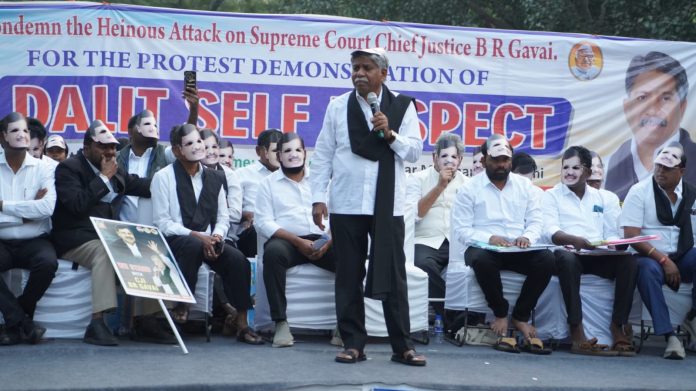 కాకతీయ, తెలంగాణ బ్యూరో: సుప్రీం కోర్టు చీఫ్ జస్టీస్ బీఆర్ గవాయి మీద జరిగిన దాడి దేశంలోని ముప్ఫై కోట్ల మంది దళిత ప్రజల మీద జరిగిన దాడే అని, దళితుల మీద దాడులకు పాల్పడే వారికి చట్టాలు వర్తించకపోవడం అత్యంత దారుణమని ఎమ్మార్పీఎస్ వ్యవస్థాపక అధ్యక్షులు, పద్మశ్రీ మంద కృష్ణ మాదిగ ధ్వజమెత్తారు. గవాయిపై జరిగిన పాశవిక దాడిని నిరసిస్తూ ఎమ్మార్పీఎస్ ఆధ్వర్యంలో న్యూఢిల్లీలోని జంతర్ మంతర్ వద్ద దళితుల ఆత్మగౌరవ సభ జరిగింది. ముఖ్య అతిథిగా పద్మశ్రీ మంద కృష్ణ మాదిగ హాజరై మాట్లాడుతూ “చట్టం ముందు అందరూ సమానులే అని రాజ్యాంగం చెప్తుంటే అందుకు విరుద్ధంగా చట్టపరమైన వ్యవస్థలు దళితుల మీద దాడులకు పాల్పడుతున్న వారి మీద చర్యలు తీసుకోవడంలేదని అన్నారు. ధర్మం ముసుగులో విశ్వాసాల ముసుగులో దాడులకు పాల్పడే వారికి చట్టాలు వర్తించవా ? వారి మీద చర్యలు తీసుకోరా అని ప్రశ్నించారు. పోలీసు వ్యవస్థ, జాతీయ మానవ హక్కుల కమిషన్ తమ కర్తవ్యాలను అమలు చేయడంలో పూర్తి వివక్షతను చూపెట్టయని అన్నారు.