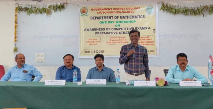 కాకతీయ, గజ్వేల్ : గజ్వేల్ ప్రభుత్వ అటానామస్ డిగ్రీ కళాశాలలో బుధవారం గణిత విభాగం ఆధ్వర్యంలో ప్రభుత్వ పోటీ పరీక్షలపై అవగాహన సదస్సు నిర్వహించారు. ఈ విషయాన్ని కళాశాల ఇన్‌చార్జి ప్రిన్సిపల్ ఎస్. గణపతి రావు తెలిపారు. ఈ కార్యక్రమాన్ని ప్రారంభించి ఆయన మాట్లాడుతూ, కృషి, పట్టుదలతో కష్టపడి చదివితేనే జీవితంలో ఉన్నత స్థాయికి చేరుకోవచ్చని విద్యార్థులకు సూచించారు. స్పష్టమైన లక్ష్యంతో క్రమశిక్షణగా చదివితే విజయాన్ని సాధించవచ్చన్నారు. కార్యశాలలో విషయ నిపుణులుగా పాల్గొన్న విశ్రాంత ఆచార్యులు డాక్టర్ వంగల శ్రీనివాసులు పోటీ పరీక్షల విధానం, అర్హతలు, పాఠ్యాంశాలు, పరీక్షా విధానం వంటి అంశాలను వివరించారు. పరీక్షల్లో విజయాన్ని సాధించేందుకు అనుసరించాల్సిన సులభమైన పద్ధతులను తెలియజేశారు. కార్యశాల కన్వీనర్ డాక్టర్ డి. వెంకటేష్ మాట్లాడుతూ, నేటి పోటీ ప్రపంచంలో సరైన ప్రణాళిక, సమయపాలన, నిరంతర సాధన అవసరమని చెప్పారు. డిగ్రీ పూర్తయ్యే నాటికి విద్యార్థులు ఉద్యోగాన్ని కూడా లక్ష్యంగా పెట్టుకుని సిద్ధం కావాలని సూచించారు. ఈ కార్యక్రమంలో కళాశాల అకాడమిక్ కోఆర్డినేటర్ జి. విజయభాస్కర్ రెడ్డి, గణితశాస్త్ర అధ్యాపకురాలు జీ. వనజ, అధ్యాపకులు, అధ్యాపకేతర సిబ్బంది, విద్యార్థులు పాల్గొన్నారు.