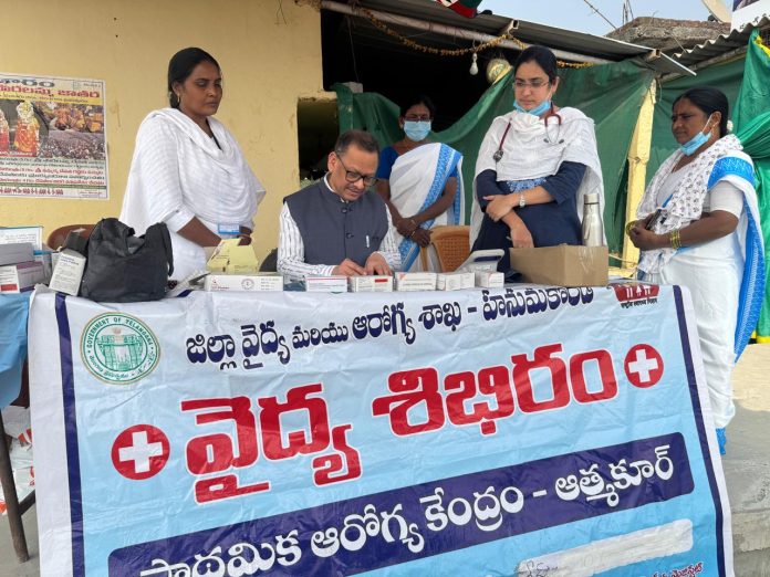 కాకతీయ, వరంగల్ సిటీ : మేడారం సమ్మక్క సారలమ్మ జాతర, అగ్రం పహాడ్ జాతర వెళ్లే భక్తులకు ఎలాంటి వైద్య పరమైన సహాయం అవసరమైనా అందించడం బాధ్యత అని, చికిత్సకు అవసరమైన అన్ని మందులు అందుబాటులో ఉంచుకోవడంతో పాటు వైద్య సిబ్బంది అప్రమత్తంగా ఉండాలని రాష్ట్ర వైద్య ఆరోగ్యశాఖ డైరెక్టర్ డాక్టర్ బి.రవీంద్ర నాయక్ సూచించారు. గురువారం ఆయన జాతర కోసం ప్రత్యేకంగా కటాక్ష పూర్ లో ఏర్పాటు చేసిన ఉచిత వైద్య శిబిరమును సందర్శించి ఆత్మకూరు వైద్యాధికారి డాక్టర్ స్పందనను క్యాంపుల వివరాలను అడిగి తెలుసుకున్నారు. అలాగే మేడారం ప్రధాన రహదారిలో ఉన్న ఆత్మకూర్ ప్రాథమిక ఆరోగ్య కేంద్రంలో 24/7 సేవలు అందించాలని, 108 ఇతర లైన్ డిపార్ట్మెంట్స్ తో సమన్వయంతో పనిచేయాలన్నారు. హనుమకొండ జిల్లాలోని మినీ సమ్మక్క సారలమ్మ జాతరతో పాటు బస్ స్టేషన్, రైల్వే స్టేషన్లలో ఏర్పాటు చేసిన 22వైద్య శిబిరాలలో భక్తులకు మెరుగైన సేవలందించాలన్నారు. స్థానిక శాసనసభ్యులు రేవూరి ప్రకాష్ రెడ్డి, జిల్లా కలెక్టర్ స్నేహ శబరీష్ సూచనలకు అనుగుణంగా అన్ని చర్యలు తీసుకున్నట్లు డాక్టర్ స్పందన తెలియజేశారు.