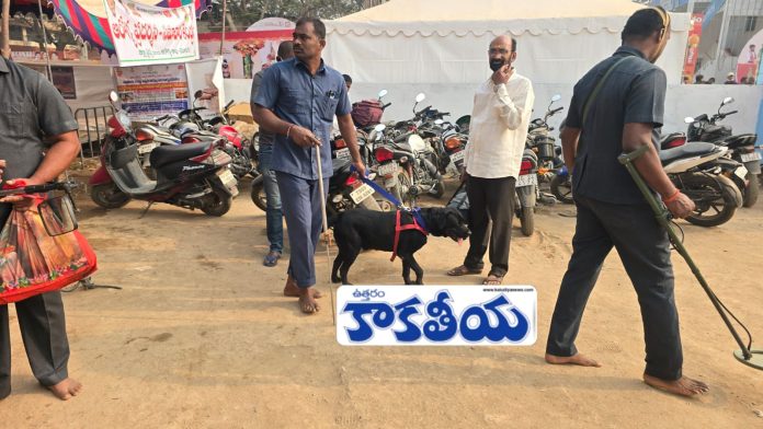 కాకతీయ, మేడారం బృందం : సమ్మక్క–సారలమ్మ మహాజాతర నేపథ్యంలో మేడారంలో భద్రతను మరింత కట్టుదిట్టం చేశారు. ఆలయ ప్రాంగణంతో పాటు పరిసర ప్రాంతాల్లో బాంబ్ స్క్వాడ్ విస్తృతంగా తనిఖీలు చేపట్టింది. ఎలాంటి అనుమానాస్పద వస్తువులు లేకుండా ప్రతి ప్రాంతాన్ని నిశితంగా పరిశీలిస్తున్నారు. గురువారం రాత్రి సమ్మక్క తల్లి గద్దెలపైకి రానున్న కీలక ఘట్టాన్ని దృష్టిలో పెట్టుకుని భక్తుల భద్రతకు అత్యంత ప్రాధాన్యం ఇస్తున్నట్లు అధికారులు తెలిపారు. ఆలయ ప్రాంగణం చుట్టూ పోలీస్, బాంబ్ డిస్పోజల్, డాగ్ స్క్వాడ్ బృందాలు సోదాలు నిర్వహించాయి