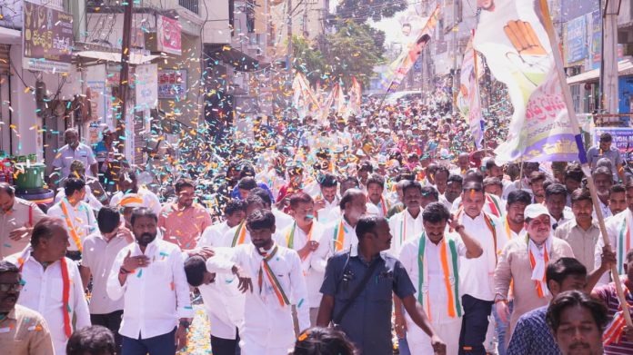 కాకతీయ, కరీంనగర్ బ్యూరో : కరీంనగర్ మున్సిపల్ కార్పొరేషన్ ఎన్నికల్లో కాంగ్రెస్ పార్టీ ప్రచారాన్ని విస్తృతంగా కొనసాగిస్తోంది. డివిజన్‌లవారీగా ఇంటింటి ప్రచారం, ర్యాలీలు, కార్నర్ మీటింగ్‌లతో ప్రజలను నేరుగా కలుస్తూ ఓటర్ల మద్దతు కూడగట్టే ప్రయత్నాలు ముమ్మరంగా సాగుతున్నాయి. మంత్రులు పొన్నం ప్రభాకర్, తుమ్మల నాగేశ్వరరావు స్వయంగా రంగంలోకి దిగి అభ్యర్థులకు అండగా ప్రచారాన్ని నడిపిస్తున్నారు. 50వ డివిజన్ జ్యోతి నగర్‌లో కాంగ్రెస్ అభ్యర్థి రాచకొండ చక్రధర్‌రావుకు మద్దతుగా నిర్వహించిన కార్యక్రమంలో మంత్రి పొన్నం ప్రభాకర్ పాల్గొన్నారు. చక్రధర్‌రావు ప్రజల్లో సుపరిచిత నాయకుడని, సేవాభావంతో పనిచేస్తున్నారని కొనియాడారు. గత పదేళ్లుగా కరీంనగర్ అభివృద్ధి నిర్లక్ష్యానికి గురైందని విమర్శించారు. కాంగ్రెస్‌కు అవకాశం ఇస్తే డంపింగ్ యార్డు, డ్రైనేజీ, రోడ్లు, తాగునీటి సమస్యలను పరిష్కరిస్తామని హామీ ఇచ్చారు. ఇందిరమ్మ ఇళ్లు, 200 యూనిట్ల ఉచిత విద్యుత్, మహిళలకు ఉచిత బస్సు ప్రయాణం వంటి సంక్షేమ పథకాలను ప్రజలకు వివరించారు. మంత్రి తుమ్మల నాగేశ్వరరావు మాట్లాడుతూ కాంగ్రెస్ కార్పొరేటర్లను గెలిపిస్తేనే పట్టణానికి నిజమైన అభివృద్ధి సాధ్యమవుతుందని తెలిపారు. గత ప్రభుత్వ వైఫల్యాల వల్ల సమస్యలు పేరుకుపోయాయని, కాంగ్రెస్‌తోనే వాటికి పరిష్కారం లభిస్తుందని అన్నారు. కరీంనగర్ అభివృద్ధి కోసం చేతి గుర్తుకు ఓటేయాలని ప్రజలకు పిలుపునిచ్చారు.