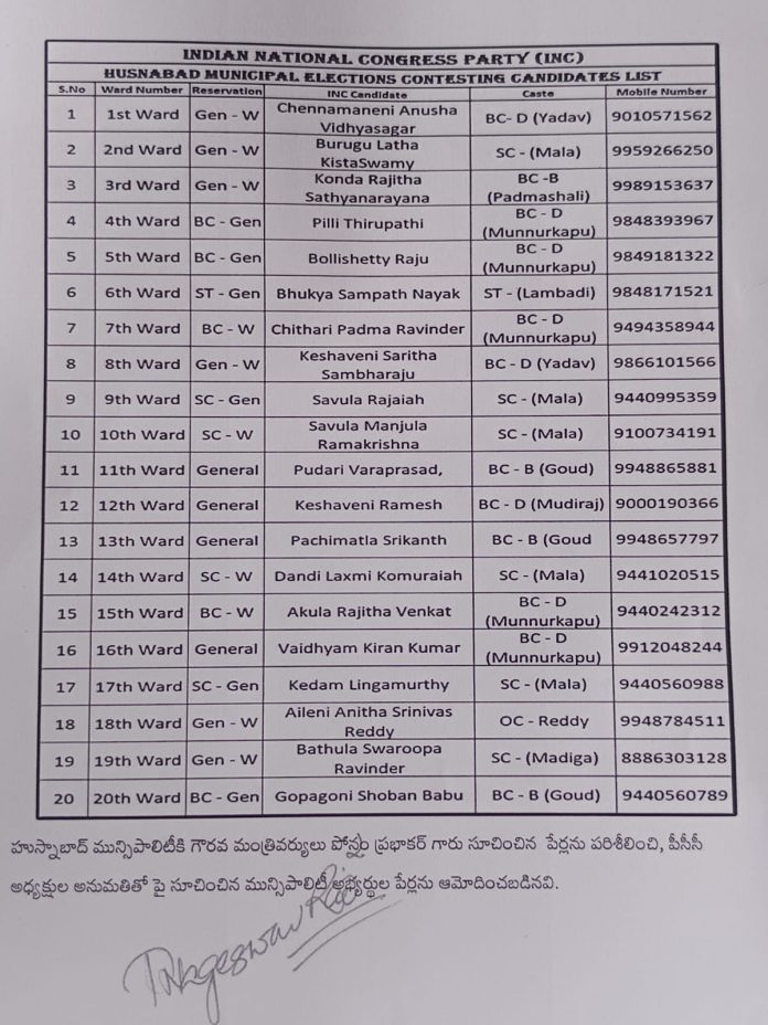 కాకతీయ, హుస్నాబాద్: సిద్దిపేట జిల్లా హుస్నాబాద్ మున్సిపాలిటీ ఎన్నికలకు కాంగ్రెస్ పార్టీ అభ్యర్థుల తుది జాబితాను పార్టీ అధిష్టానం ప్రకటించింది. హుస్నాబాద్ మున్సిపాలిటీలో మొత్తం 20 వార్డులు ఉండగా, అన్ని వార్డులకు కాంగ్రెస్ పార్టీ తరఫున పోటీ చేయనున్న అభ్యర్థులను అధికారికంగా ఖరారు చేసింది.