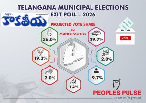 116 మున్సిపాలిటీల పరిధిలో కాంగ్రెస్కు 36 శాతం ఓట్లు, బీఆర్ఎస్కు 29.7 శాతం, బీజేపీకి 19.3 శాతం, ఎంఐఎంకు 2 శాతం ఓట్లు దక్కే అవకాశం ఉందని పీపుల్స్ పల్స్ అంచనా వేసింది.