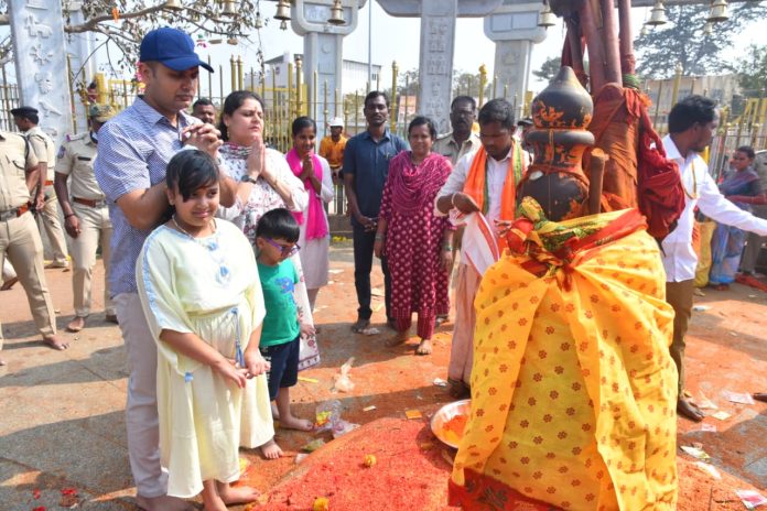 కాకతీయ, హనుమకొండ : వరంగల్ పోలీస్ కమిషనర్ సన్‌ప్రీత్ సింగ్ కుటుంబ సభ్యులతో కలిసి శనివారం మేడారం సమ్మక్క–సారలమ్మ అమ్మవార్లను దర్శించుకుని ప్రత్యేక పూజలు నిర్వహించారు. అమ్మవార్లకు మొక్కులు చెల్లించిన అనంతరం ఆలయ పూజారులు సీపీ దంపతులను శాలువాతో సత్కరించి, అమ్మవార్ల పసుపు, కుంకుమలు, ప్రసాదాన్ని అందజేశారు. ఈ సందర్భంగా పోలీస్ కమిషనర్ ములుగు ఎస్పీ కేకన్‌తో పాటు ఇతర పోలీస్ అధికారులతో మేడారం జాతర సందర్భంగా చేపట్టాల్సిన బందోబస్తు ఏర్పాట్లపై చర్చించారు. జాతరను భక్తులకు ఎలాంటి ఇబ్బందులు లేకుండా ప్రశాంతంగా నిర్వహించేందుకు అవసరమైన చర్యలపై అధికారులకు సూచనలు ఇచ్చారు.