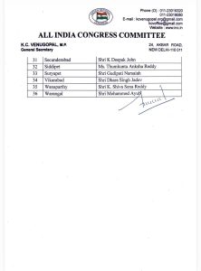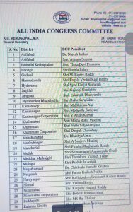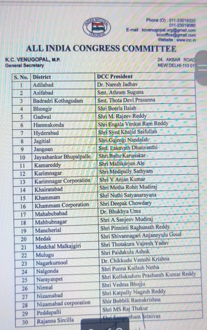 కాక‌తీయ‌, తెలంగాణ బ్యూరో : స్థానిక ఎన్నిక‌ల నేప‌థ్యంలో కాంగ్రెస్ పార్టీ కీల‌క నిర్ణ‌యం తీసుకుంది. 30 జిల్లాల‌కు పార్టీ అధ్యక్షుల‌ను ఏఐసీసీ ప్ర‌క‌టిస్తూ శ‌నివారం ఉత్త‌ర్వులు జారీ చేయ‌డం గ‌మ‌నార్హం. 30 జిల్లాల‌కు డీసీసీ అధ్యక్షుల జాబితా ఈవిధంగా ఉంది.