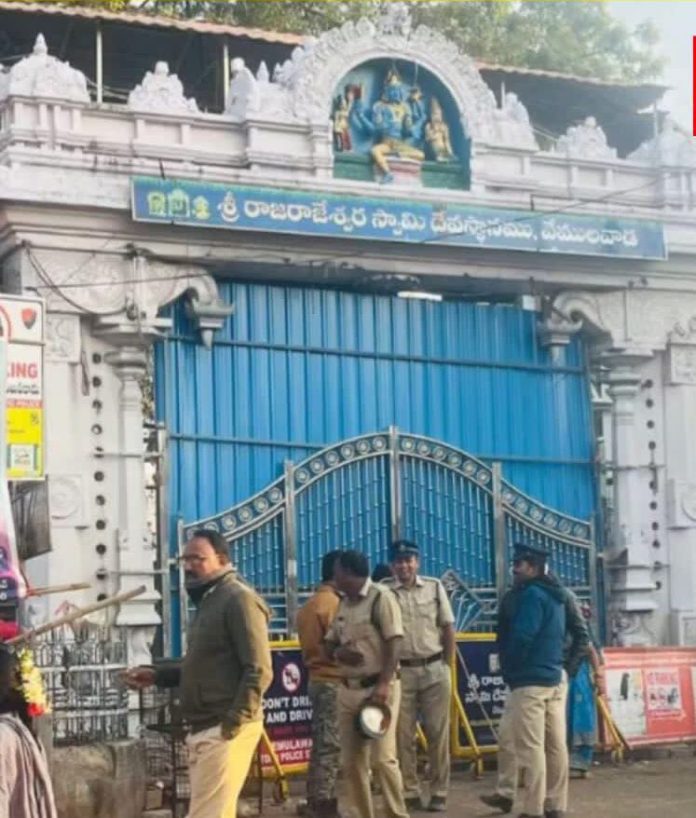 కాకతీయ, వేములవాడ : దక్షిణ కాశీగా పేరుగాంచిన వేములవాడ శ్రీ రాజరాజేశ్వర స్వామి ఆలయంలో బుధవారం భక్తులకు పెద్ద షాక్ తగిలింది. ముందస్తు సమాచారం లేకుండానే ఆలయ అధికారులు స్వామివారి దర్శనాలను నిలిపివేయడంతో భక్తులు తీవ్ర ఆగ్రహం వ్యక్తం చేశారు.తెల్లవారుజామున నుంచే స్వామివారి దర్శనం కోసం పలు ప్రాంతాల నుంచి వచ్చిన భక్తులను అధికారులు ఆలయ ప్రధాన గేటు వద్దే ఆపేశారు. గేటుకు తాళం వేసి, రేకులు ఏర్పాటు చేయడంతో భక్తులు అసహనం వ్యక్తం చేస్తూ ఆలయ ద్వారాల ఎదుట ఆందోళనకు దిగారు.అయితే ఆలయ అభివృద్ధి పనులు కొనసాగుతున్న నేపథ్యంలో రాజరాజేశ్వర స్వామివారి దర్శనాలను తాత్కాలికంగా నిలిపివేయాల్సి వచ్చిందని అధికారులు వెల్లడించారు. భక్తుల సౌలభ్యార్థం ఆలయ ప్రాంగణంలో ఏర్పాటు చేసిన ఎల్ఈడి స్క్రీన్ల ద్వారా స్వామివారి దర్శనాన్ని కల్పించారు.ఎంతో దూరం నుంచి కుటుంబ సమేతంగా వచ్చి మొక్కులు చెల్లించాలనుకున్న భక్తులు దర్శనం లేకపోవడంతో నిరాశ వ్యక్తం చేశారు.ముందస్తుగా ప్రకటించి ఉంటే ఇంత ఇబ్బంది పడేవాళ్లం కాదని వారు ఆవేదన వ్యక్తం చేశారు.