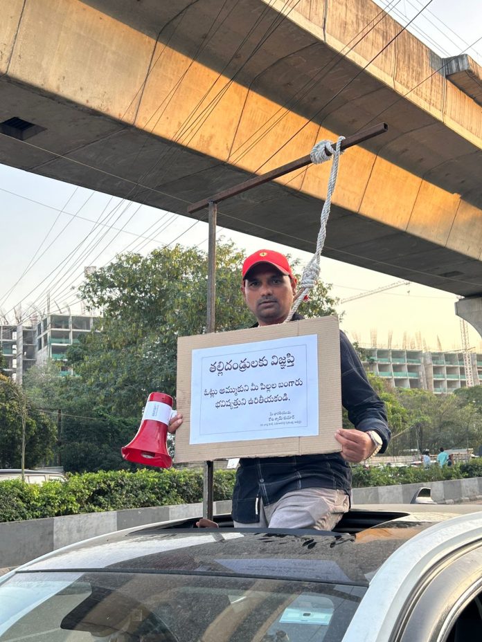 కాకతీయ, కరీంనగర్ : జూబ్లీహిల్స్‌ ఎన్నికలలో స్వతంత్ర అభ్యర్థిగా పోటీ చేస్తున్న కోట శ్యామ్‌కుమార్‌ తన ప్రచారాన్ని వినూత్నంగా ప్రారంభించారు. ప్రజలలో ఆలోచన రేకెత్తించే విధంగా మెడకు ఉరి వేసుకుని ఓట్లు అమ్ముకోవద్దు… మీ పిల్లల బంగారు భవిష్యత్తుని ఉరితీయకండి అంటూ తల్లిదండ్రులకు హృదయవిదారక విజ్ఞప్తి చేశారు.తన ఈ వినూత్న పద్ధతి స్థానికుల దృష్టిని ఆకర్షించింది. రాజకీయాలపై నిర్లక్ష్యంగా ఉన్న యువతను చైతన్యపరచాలని, శుభ్రమైన రాజకీయాల కోసం తనకు మద్దతు ఇవ్వాలని శ్యామ్‌కుమార్‌ కోరారు.ఓటు పవిత్రమైనది, దానిని అమ్ముకోవడం అంటే మన భవిష్యత్తును తామే నాశనం చేసుకోవడమే అని ఆయన అన్నారు.ప్రజల్లో సందేశాత్మకంగా మారిన ఈ ప్రచారం ప్రస్తుతం జూబ్లీహిల్స్‌లో చర్చనీయాంశమైంది.