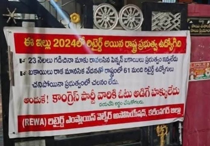 కాకతీయ, కరీంనగర్ బ్యూరో : మున్సిపల్ ఎన్నికల వేళ కరీంనగర్‌లో ప్రభుత్వ నిర్లక్ష్యంపై ఓ రిటైర్డ్ ఉద్యోగి చేపట్టిన వినూత్న నిరసన రాజకీయ వర్గాల్లో చర్చకు దారితీసింది. సమస్య చెప్పుకునేందుకు సభలు, ర్యాలీలు కాకుండా తన ఇంటి గోడపైనే ఫ్లెక్సీ ఏర్పాటు చేసి ప్రభుత్వాన్ని నేరుగా నిలదీశారు. 2024లో పదవీ విరమణ చేసినప్పటికీ 23 నెలలు గడిచినా తన పెన్షన్ బకాయిలు చెల్లించలేదని ఆ ఫ్లెక్సీలో పేర్కొన్నారు. రాష్ట్రవ్యాప్తంగా పెన్షన్ బకాయిలు అందక మానసిక వేదనతో ఇప్పటికే 61 మంది రిటైర్డ్ ఉద్యోగులు మృతి చెందినా ప్రభుత్వం స్పందించకపోవడం దారుణమని ఆవేదన వ్యక్తం చేశారు. బకాయిలు ఇవ్వలేని ప్రభుత్వం ఎన్నికల సమయంలో ఓటు అడగడం ఎంతవరకు సమంజసమని ప్రశ్నించారు. ఇది ఒక్క వ్యక్తి సమస్య కాదని, వేలాది రిటైర్డ్ ఉద్యోగుల బాధను ప్రతిబింబించే గోడ నిరసనగా పేర్కొన్నారు. రిటైర్డ్ ఎంప్లాయిస్ వెల్ఫేర్ అసోసియేషన్ కరీంనగర్ జిల్లా శాఖ ఆధ్వర్యంలో ఈ ఫ్లెక్సీ ఏర్పాటు చేశారు. ఎన్నికల హామీల హోరులో పెన్షన్ బకాయిలపై ప్రభుత్వ మౌనాన్ని ఈ నిరసన తేటతెల్లం చేస్తోందని పలువురు అభిప్రాయపడుతున్నారు.