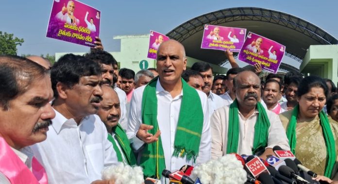 అనంతరం హరీశ్ రావు విలేకరులతో మాట్లాడారు. సీఎం రేవంత్ రెడ్డి సర్కారు తీరును ఎండగట్టారు. ఎరువులందవు, విత్తనాలు అందవు, కరెంటు సరిగ్గా రాదు. రైతుబంధు రాదు. రుణమాఫీ జరగదు. బోనస్ ఎగ బెడతావు. పంటల బీమా లేదు. ఇంతే కదా రేవంత్ రెడ్డి, వరంగల్ డిక్లరేషన్ లో చెప్పిన ఒక్క హామీ అయిన కాంగ్రెస్ ప్రభుత్వం అమలు చేసిందా? అని ప్రశ్నించారు. దిగుమతి సుంకాలు ఎత్తివేసి బీజేపీ కేంద్ర ప్రభుత్వం రైతులపై ఆంక్షలు పెట్టడం సరికాదన్నారు. పత్తి, పామాయిల్ దిగుమతులపై సుంకం ఎత్తేసి ఎవరికి లాభం చేస్తున్నారు? ఎందుకు రైతుల మెడకు ఉరితాడు బిగిస్తున్నారని అసహనం వ్యక్తం చేశారు. బడా కాంట్రాక్టర్లకు, కార్పొరేట్లకు లాభం చేసేందుకు రైతులను అన్యాయం చేస్తుందని కేంద్ర ప్రభుత్వంపై విరుచుకుపడ్డారు. దేశంలో మొట్టమొదటిసారి రైతులకు రైతుబంధు తెచ్చింది కేసీఆర్ ప్రభుత్వమేనని గుర్తు చేశారు. రేవంత్ రెడ్డి మేలుకోకపోతే తెల్ల బంగారం తెచ్చి జూబ్లీహిల్స్ ప్యాలెస్ ముందు పోస్తామని హెచ్చరించారు.