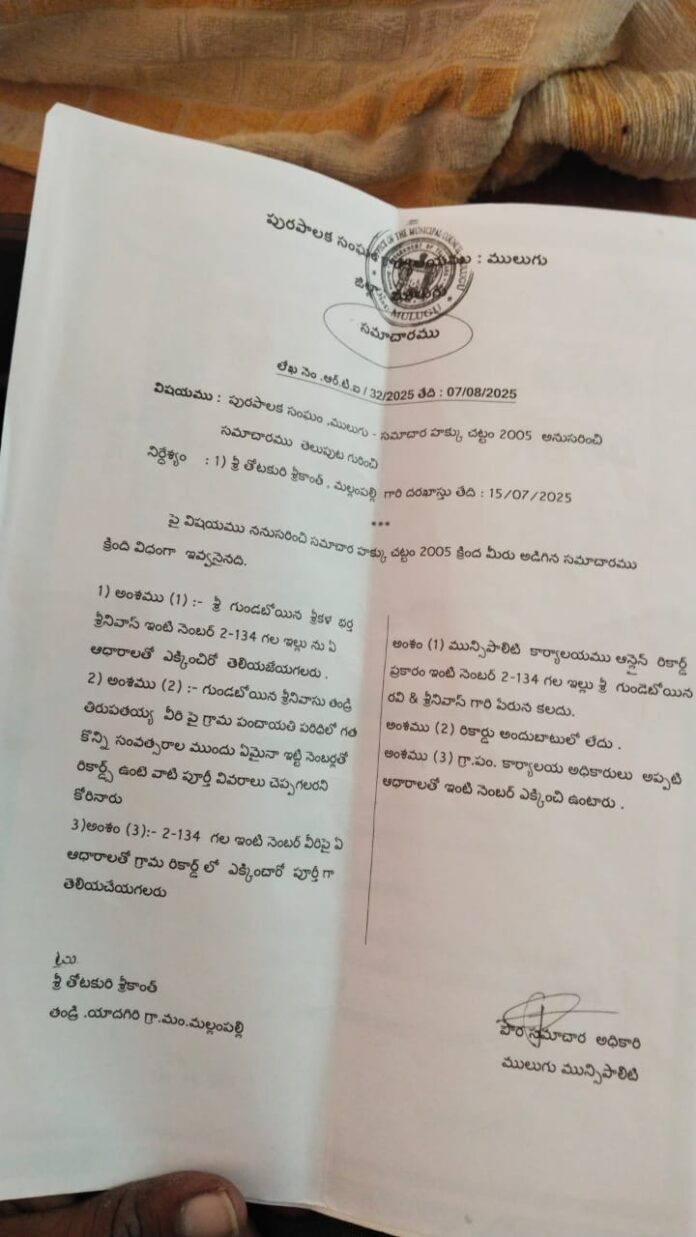 ములుగు మున్సిపాలిటీ ఏర్పడక ముందు, 2019లో ములుగు గ్రామపంచాయతీ కార్యాలయంలో ఈ అవకతవకలు చోటుచేసుకున్నాయి. ఒక మహిళ తనపై ఉన్న ఇంటికి సంబంధించిన ధ్రువీకరణ పత్రం కావాలని పంచాయతీ కార్యాలయాన్ని సంప్రదించింది. రికార్డుల్లో ఎలాంటి పేరు లేకపోయినా, నాటి కార్యదర్శి, సిబ్బంది సహకారంతో ఉన్నట్టుగా చూపించి ధ్రువీకరణ పత్రం జారీ చేశారు అని, ఆ పత్రం ఆధారంగా ఆ మహిళ తన భర్త పేరుతో సబ్ రిజిస్ట్రార్ కార్యాలయంలో ఇంటి రిజిస్ట్రేషన్ కూడా పూర్తి చేసుకుంది అని, లేనిది ఉన్నట్టుగా, ఉన్నది లేనట్టుగా చిత్రీకరించడం ఎంత సులువో ఈ ఘటన మళ్లీ రుజువు చేస్తోందని జిల్లా ప్రజలు వ్యాఖ్యానిస్తున్నారు.
