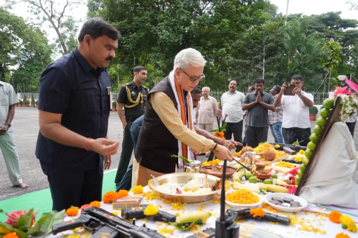 కాకతీయ, తెలంగాణ బ్యూరో : తెలంగాణ గవర్నర్ జిష్ణు దేవ్ వర్మ రాజ్ భవన్లో మంగళవారం ఆయుధ పూజ, వాహన పూజ నిర్వహించారు. దసరా పండుగ సందర్భంగా గవర్నర్ భద్రతా సిబ్బంది ఆయుధాలతోపాటు రాజ్ భవన్కు చెందిన అన్ని వాహనాలకు ప్రత్యేక పూజలు చేశారు. రాజ్ భవన్ ప్రాంగణంలోని ఆలయం సమీపంలో ఏర్పాటు చేసిన ఈ కార్యక్రమంలో సీనియర్ అధికారులు, సిబ్బంది పాల్గొన్నారు. ఈసందర్భంగా అధికారులు, సిబ్బందికి గవర్నర్ జిష్ణుదేవ్ దసరా శుభాకాంక్షలు తెలిపారు.