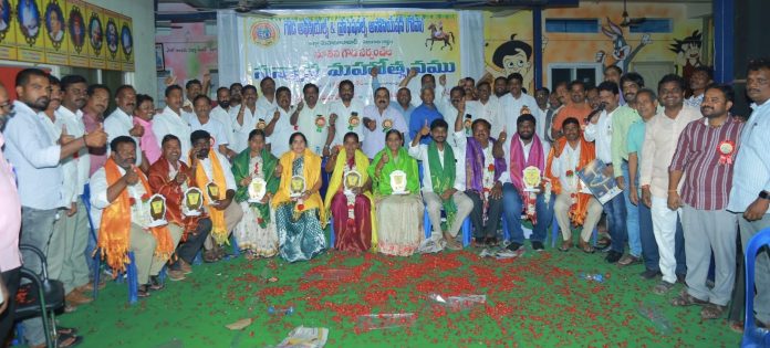 కాకతీయ, తొర్రూరు : మహబూబాబాద్ జిల్లాలో నూతనంగా ఎన్నికైన గౌడ సర్పంచ్లు ఆదర్శవంతమైన పాలన అందించి మిగతా వారందరికీ స్ఫూర్తిగా నిలవాలని గోపా రాష్ట్ర ఉపాధ్యక్షులు రామ్మోహన్ గౌడ్, జిల్లా అధ్యక్షులు కుర్ర శ్రీనివాస్ గౌడ్ పిలుపునిచ్చారు. గోపా జిల్లా శాఖ అధ్యక్షులు కుర్ర శ్రీనివాస్ గౌడ్ అధ్యక్షతన, తొర్రూరు డివిజన్ అధ్యక్షులు తాళ్లపల్లి రమేష్ గౌడ్ సౌజన్యంతో స్థానిక వికాస్ హైస్కూల్ నూతన భవనంలో జిల్లా స్థాయి సమావేశం నిర్వహించారు. ఈ కార్యక్రమంలో జిల్లాలో నూతనంగా ఎన్నికైన 15 మంది గౌడ సర్పంచ్లను ఒకే వేదికపైకి ఆహ్వానించి శాలువాలు కప్పి ఘనంగా సన్మానించారు.