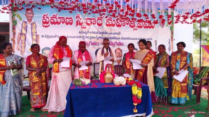 కాకతీయ, రాయపర్తి : గ్రామ ప్రజలు నాపై ఉంచిన అపారమైన నమ్మకాన్ని గుండెల్లో పెట్టుకుని, ఎట్టి పరిస్థితుల్లోనూ వారి విశ్వాసాన్ని వమ్ము చేయబోనని కిష్టాపురం నూతన సర్పంచ్ కొండం రంగారెడ్డి స్పష్టం చేశారు. సోమవారం గ్రామంలో నిర్వహించిన ప్రమాణ స్వీకార మహోత్సవ కార్యక్రమంలో గ్రామ ప్రత్యేక అధికారి వీరగోని శృతి ఆయనతో సర్పంచ్‌గా ప్రమాణం చేయించారు. అనంతరం ఆయన అధికారికంగా పదవి బాధ్యతలు స్వీకరించారు. ఈ సందర్భంగా రంగారెడ్డి మాట్లాడుతూ, గ్రామ ప్రజలందరూ ఏకమై తనను ఏకగ్రీవంగా ఎన్నుకోవడం ఎంతో ఆనందాన్ని కలిగించిందని హర్షం వ్యక్తం చేశారు. ఈ పదవిని అధికారంగా కాకుండా గ్రామ ప్రజలకు సేవ చేసే గొప్ప అవకాశంగా భావిస్తానని తెలిపారు. గ్రామ అభివృద్ధే తన ప్రధాన లక్ష్యమని, ప్రతి రూపాయిని గ్రామ అవసరాలకే వినియోగిస్తానని హామీ ఇచ్చారు.