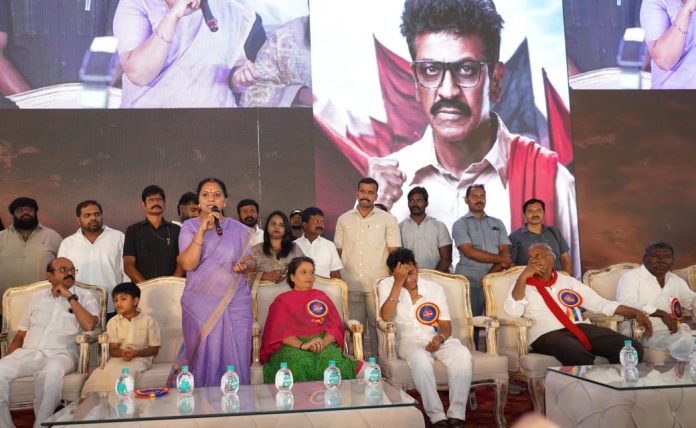 ఈ చిత్రాన్ని ఐదు భాషల్లో తీస్తుండటం మనస్ఫూర్తిగా అభినందించే విషయం. సినిమాలో ప్రధాన పాత్రను పోషించేందుకు శివ రాజ్ కుమార్ అంగీకరించటం ద్వారా సినిమాకు వన్నె వచ్చింది. ఆయనను మనస్ఫూర్తిగా అభినందిస్తూ కృతజ్ఞతలు తెలుపుతున్నా. ఎంతో మంది యువకులు రాజకీయాల్లోకి వచ్చేందుకు ఈ సినిమా స్ఫూర్తిగా నిలుస్తుందని భావిస్తున్నా. ఖమ్మంలో పాల్వంచలో 1969, 2001 నాటి తెలంగాణ ఉద్యమకారులు చాలా మంది ఉన్నారు. కానీ వారందరికీ కూడా లభించాల్సిన ఆదరణ, రాజకీయ అవకాశాలు, ఆర్థిక స్వావలంభన, గౌరవం దక్కలేదు. వారికి అవన్నీ కూడా దక్కే వరకు పోరాటం చేస్తామని జనంబాట ప్రారంభంలోనే చెప్పాం. ఇక ముందు కూడా అదే విధంగా పోరాటం చేస్తాం. సబ్బండ వర్గాలకు రాజకీయాల్లో ప్రాధాన్యం లభించాలంటే సామాజిక తెలంగాణ అవసరం. ఈ పోరాటం లో ఉద్యమకారులను, అమరవీరుల కుటుంబాలను, అధికారానికి దూరంగా ఉన్న వర్గాలను కలుపుకొని పోతాం. ముఖ్యంగా అధికారానికి దూరంగా ఉన్న మా మహిళలను కలుపుకొని సామాజిక తెలంగాణ సాధిస్తాం… అని కవిత అన్నారు.