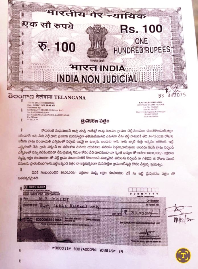 కాకతీయ, కరీంనగర్ బ్యూరో : కరీంనగర్ జిల్లా మానకొండూరు మండల పరిధిలోని వెల్ది గ్రామంలో సర్పంచ్ ఎన్నికల వేడి మధ్య అభ్యర్థి కొరుకంటి మధు సుదన్ రావు ఇచ్చిన విరాళ హామీ స్థానికంగా సంచలనానికి దారి తీసింది. సర్పంచ్గా గెలుపొందిన వెంటనే గ్రామ పంచాయతీ అభివృద్ధికి స్వచ్ఛందంగా రూ.30 లక్షలు అందజేస్తానని ఆయన హామీ పత్రం ద్వారా ప్రకటించారు. గ్రామ పెద్దలు, యువకులు, మహిళల సమక్షంలో విడుదల చేసిన ఈ హామీ పత్రంలో గ్రామ అభివృద్ధి పనులను వ్యక్తిగతంగా పర్యవేక్షించి అవసరమైతే ప్రభుత్వం నుంచి అదనపు నిధులు మంజూరు చేయించేలా కృషి చేస్తానని మధు సుదన్ రావు పేర్కొన్నారు. అవినీతి రహిత, పారదర్శక పరిపాలన అందించడం తన ప్రధాన లక్ష్యమని తెలిపారు.