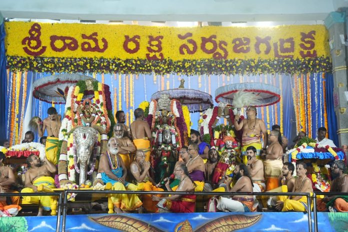 వేదపండితులు, స్థానాచార్యులు ముక్కోటి ఏకాదశి విశిష్టతను వివరించగా అర్చకులు 108 ఒత్తులతో మహాహారతి నిర్వహించారు. అనంతరం ఉత్సవ మూర్తులను మాడ వీధుల్లో భక్తిశ్రద్ధల మధ్య ఊరేగించారు. ఈ సందర్భంగా స్వామివారు గరుడ వాహనంపై శ్రీమహావిష్ణు అలంకారంలో భక్తులకు దర్శనమిచ్చారు. శ్రీరామ పదాక్షరీ మంత్రంతో అష్టోత్తర శతనామార్చన, చతుర్వేద పఠనం, గరుడ ప్రబంధాలు, ఇతిహాస పఠనం, శరణాగతి గజగరుడ దండం, భక్తరామదాసు రచించిన దాశరథి శతక పఠనం తదితర విశేష పూజా కార్యక్రమాలు నిర్వహించారు. వైకుంఠ రాముడికి అష్టోత్తర శతహారతిని భక్తిశ్రద్ధలతో సమర్పించారు. భక్తరామదాసు కాలం నుంచీ కొనసాగుతున్న సంప్రదాయం ప్రకారం భద్రాచలం తహసీల్దార్ మూలవిరాట్టులకు స్నపన కార్యక్రమం నిర్వహించారు. ఉత్తర ద్వార దర్శనం అనంతరం వైకుంఠ రాముడు తిరువీధి సేవకు బయలుదేరారు. చలువ చప్పర వాహనంపై పెరియాళ్వార్, నమ్మాళ్వార్, మరో వాహనంపై అండాళ్ అమ్మవారు, హనుమత్ వాహనంపై లక్ష్మణస్వామి, గజవాహనంపై సీతమ్మవారు, గరుడ వాహనంపై శ్రీ సీతారామచంద్ర మూర్తుల తిరువీధి సేవ మేళతాళాలు, భాజా భజంత్రీలు, వేదమంత్రోచ్చారణల మధ్య శోభాయమానంగా సాగింది. రాపత్తు ఉత్సవాలతో వేడుకలు మరింత వైభవాన్ని సంతరించుకున్నాయి.