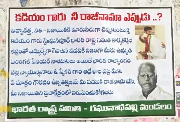 కడియం గారు నీ రాజీనామా ఎప్పుడు..? అంటూ ప్రారంభమైన పోస్టర్లలో విద్యావేత్త, నీతి – నిజా యితీకి మారుపేరుగా చెప్పుకుంటున్న కడియం స్టేషన్ ఘన్పూర్ భారత రాష్ట్ర సమితి కార్యకర్తల కష్టంతో ఎమ్మెల్యేగా గెలిచిన పదవికి నిజంగా మీరు ఉమ్మడి వరంగల్ సీనియర్ నాయకులు అయితే భారత రాజ్యాంగం పట్ల న్యాయస్థానాలు & స్పీకర్ ఆధేశాల పట్ల మీకు ఏ మాత్రం గౌరవం ఉన్న తక్షణమే మీ పదవికి రాజీనామ చేసి, మీ నిజాయితిని ప్రజాక్షేత్రంలో నిరుపించుకోగలరు అని ఉన్న పోస్టర్లు ఇప్పుడు జనగామ జిల్లాలో కలకలం రేపుతుంది. బీఆర్ఎస్ స్థానిక నేతలు కడియం శ్రీహరి గతంలో ఎమ్మెల్యేగా, మంత్రిగా నిలబడటానికి తాము చేసిన కృషినే కారణమని స్పష్టం చేశారు. తాము రాత్రింబవళ్ళు కష్టపడి పోరాడక పోతే కడియం కి పదవి దక్కేదే కాదని పేర్కొన్నారు. అయితే ఇప్పుడు ఆయన పార్టీ మార్పు గురించి ఆలోచించడం అనైతికమని, వెంటనే పదవి నుంచి రాజీనామా చేయాలని స్పష్టమైన డిమాండ్ చేశారు.