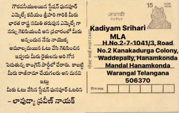 కాంగ్రెస్ ప్రభుత్వం వైఫల్యం కారణంగా యూరియా కొరత రైతులు అరిగోస పడుతున్నారంటూ ధర్మసాగర్కు చెందిన బీఆర్ ఎస్ నేత లావుడ్యా ప్రవీణ్ నాయక్ కడియంకు లెటర్ రాశారు. మీరు మాకు ఇచ్చిన మాట నిలుపుకోలేదు.. రైతుల కష్టాలను తీర్చడం లేదు. మీరు మాట తప్పినందుకు వెంటనే ఎమ్మెల్యే పదవీకి రాజీనామా చేయండని పేర్కొంటూ కడియంకు ఉత్తరం రాశాడు.