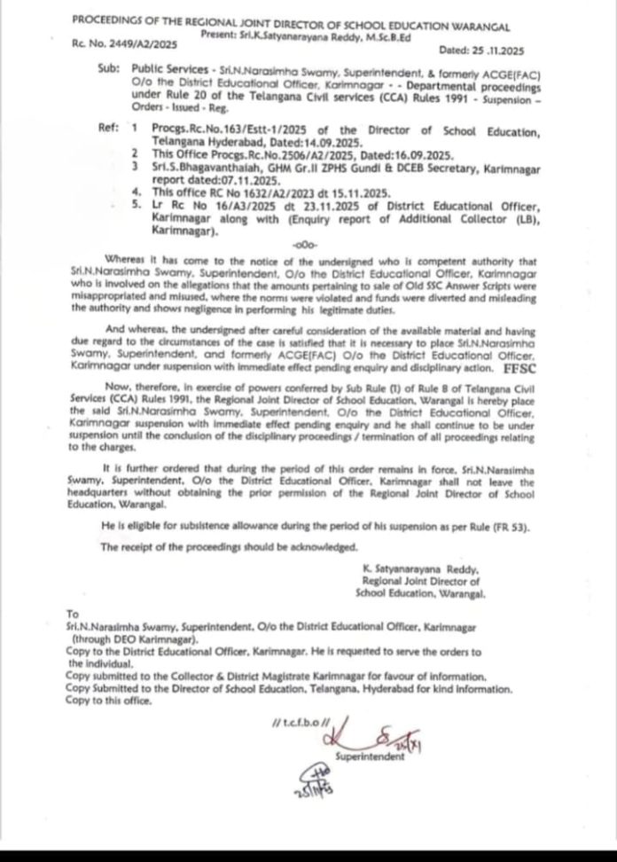 కాకతీయ, కరీంనగర్ : కరీంనగర్ జిల్లా విద్యాశాఖలో 10వ తరగతి మూల్యాంకనం పేపర్లు అమ్మకాలు, అవినీతికి పాల్పడ్డారన్న ఆరోపణలతో అప్పటి ఏసీజీఈ, ప్రస్తుత సూపరింటెండెంట్ నరసింహ స్వామి సస్పెండ్ అయ్యారు. వివాదాస్పద వార్తలు పత్రికల్లో వెలువడిన నేపథ్యంలో శాఖాపరమైన విచారణ చేపట్టి వరంగల్ ఆర్ జేడీ ఆదేశాల ప్రకారం సస్పెన్షన్ ఉత్తర్వులు జారీ చేశారు.