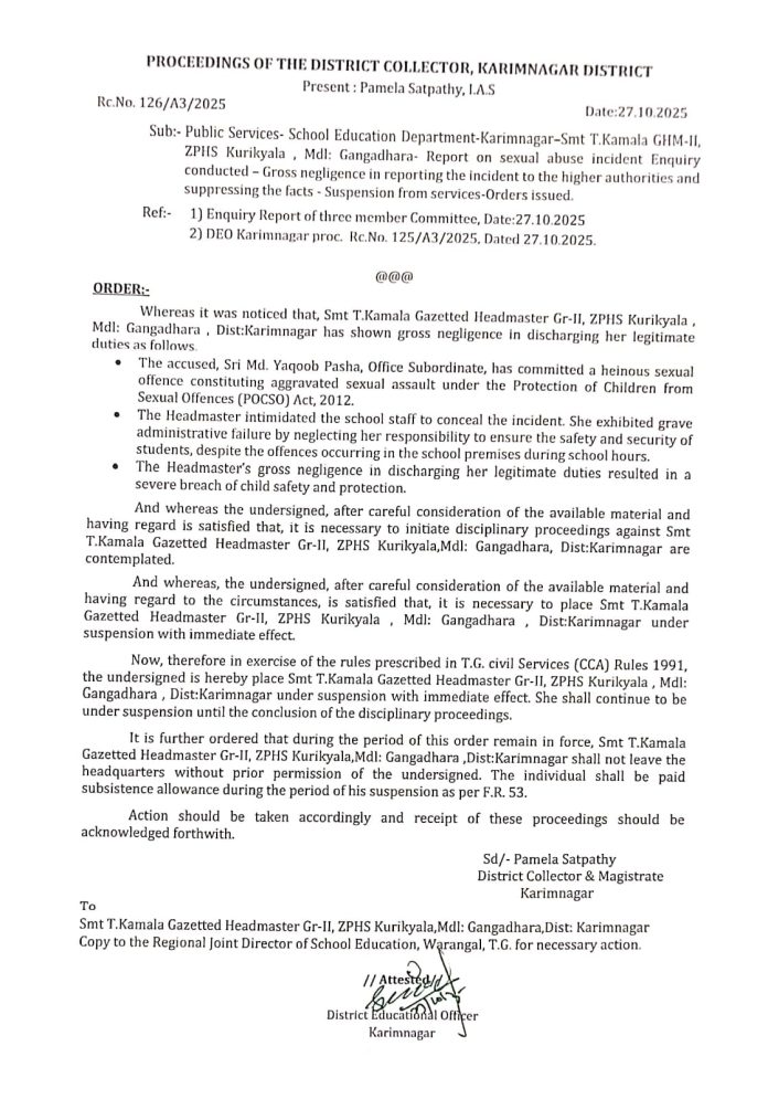 విచారణ కమిటీ సమర్పించిన నివేదికలో ప్రధానోపాధ్యాయురాలు కమల ఘటనను దాచిపెట్టడానికి పాఠశాల సిబ్బందిపై ఒత్తిడి తెచ్చినట్లు విద్యార్థుల భద్రత పట్ల నిర్లక్ష్యం ప్రదర్శించినట్లు స్పష్టమైంది. దాంతో కలెక్టర్ పమేలా సత్పతి కఠినంగా స్పందించి ఆమెను తక్షణమే సస్పెండ్ చేయాలని ఆదేశాలు జారీ చేశారు. సస్పెన్షన్ ఉత్తర్వుల్లో కమల ముందస్తు అనుమతి లేకుండా హెడ్క్వార్టర్ను వదిలి వెళ్లరాదని స్పష్టమైన ఆదేశాలు జారీ చేశారు. ఇదే కేసులో లైంగిక వేధింపుల ఆరోపణలతో అటెండర్ యాకూబ్ పాషాను ఇప్పటికే సస్పెండ్ చేసిన విషయం తెలిసిందే. ఈ పరిణామంతో కురిక్యాల పాఠశాల ఘటనపై జిల్లా విద్యాశాఖలో కలకలం రేగింది. తల్లిదండ్రులు, ఉపాధ్యాయ సంఘాలు ప్రభుత్వాన్ని మరింత కఠిన చర్యలు తీసుకోవాలని బాలికల భద్రతపై ప్రత్యేక దృష్టి సారించాలని డిమాండ్ చేస్తున్నారు.