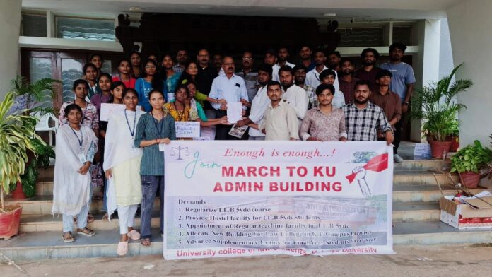 కాకతీయ, వరంగల్ బ్యూరో : కాకతీయ విశ్వవిద్యాలయం న్యాయ కళాశాల విద్యార్థులు తమ సమస్యల పరిష్కారం కోసం చేపట్టిన ఆందోళన రెండో రోజు కొనసాగింది. ఐదు సంవత్సరాల లా కోర్సు రెగ్యులరైజేషన్తో పాటు హాస్టల్ వసతి, బస్ సౌకర్యం, రెగ్యులర్ ఫ్యాకల్టీ నియామకం, బార్ కౌన్సిల్ ఫీజు రద్దు తదితర డిమాండ్లతో విద్యార్థులు 12న ఉదయం 11 గంటల నుండి ర్యాలీగా బయలుదేరి, విశ్వవిద్యాలయం పరిపాలన భవనం ఎదుట నిరసన బైఠాయించారు.