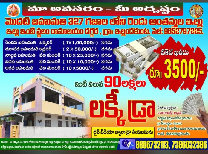 కాకతీయ, జమ్మికుంట: ఇల్లందకుంట మండల కేంద్రంలో “మా అవసరం – మీ అదృష్టం” అనే పేరుతో లక్కీ డ్రా నిర్వహిస్తున్నట్లు పెద్ద ఎత్తున ప్రచారం జరుగుతోంది. రూ.3500 టికెట్‌తో 90 లక్షల ఇల్లు, లక్షల రూపాయల బహుమతులు ఇస్తామని పోస్టర్లు, సోషల్ మీడియా ద్వారా ప్రచారం చేస్తూ ప్రజలను ఆకర్షిస్తున్నారు. 327 గజలలో రెండు అంతస్తుల భవనం కోసం 2500 టోకెన్స్ మొత్తం అమ్ముుుతున్నట్లు నిర్వాకులు పోస్టర్ తయారు చేశారు. రూ.3500 చెల్లిస్తే మొదటి బహుమతిగా రూ.1 లక్ష, రెండో బహుమతిగా రూ.50 వేల చొప్పున బహుమతులు ఇస్తామని ప్రకటిస్తూ ప్రజలను ఆకర్షిస్తున్నారు. అయితే ఇలాంటి లక్కీ డ్రాలు నిర్వహించడానికి ప్రభుత్వ అనుమతి ఉందా లేదా అన్న విషయంపై స్పష్టత లేకపోవడం గమనార్హం.