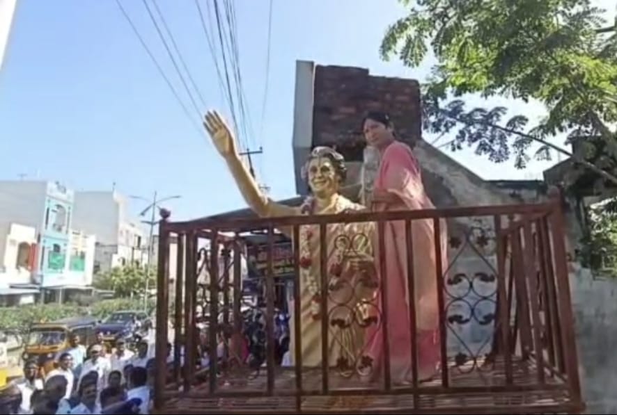 పూల మాల తొల‌గించిన త‌ర్వాత మ‌ళ్లీ విగ్ర‌హానికి పూల‌మాల‌వేసి నివాళుల‌ర్పిస్తున్న మంత్రి సురేఖ‌