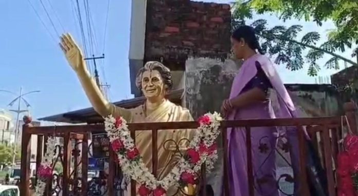 వ‌రంగ‌ల్‌లో ఇందిరా గాంధీ విగ్ర‌హానికి పూల‌మాల వేసి నివాళుల‌ర్పిస్తున్న డీసీసీ అధ్య‌క్షురాలు స్వ‌ర్ణ‌