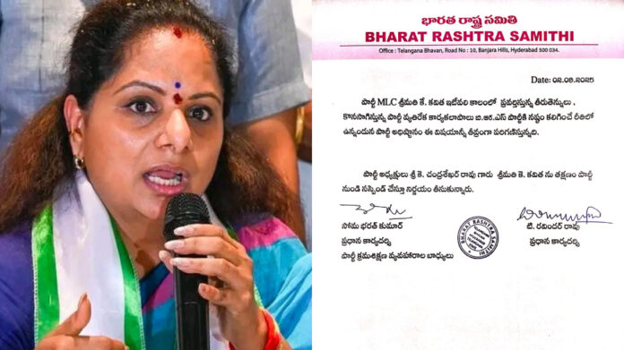 కాకతీయ, తెలంగాణ బ్యూరో: తెలంగాణ రాష్ట్ర సమితి (బి ఆర్ ఎస్ ) పార్టీ కార్యాలయం లో నేడు ఎమ్మెల్సీ కవితను పార్టీ నుంచి సస్పెండ్ చేసినట్లు అధికారికంగా ప్రకటించింది. గత కొన్ని వారాలుగా కవిత పార్టీ వ్యతిరేక స్వరాన్ని పలకుతూ, ప్రభుత్వ నడుపుదలకు విరుద్ధంగా వ్యాఖ్యలు చేస్తూ ఉండటం తెలిసిందే.