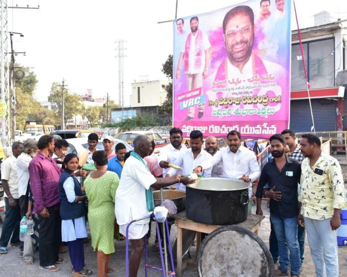 కాకతీయ, వరంగల్ సిటీ : బీఆర్ఎస్ పార్లమెంటరీ పార్టీ రాజ్యసభ సభ్యులు వద్దిరాజు రవిచంద్ర జన్మదిన వేడుకలు వరంగల్ తూర్పులో ఘనంగా జరిగాయి. ఈ సందర్భంగా నగరంలోని పోచమ్మమైదాన్ జంక్షన్లో వీఆర్సీ యూత్ ఆధ్వర్యంలో పలు సేవా కార్యక్రమాలు నిర్వహించి జన్మదినాన్ని ప్రజలతో కలిసి జరుపుకున్నారు. వేడుకల్లో భాగంగా భారీ కేక్ను కట్ చేసి సుమారు 300 మందికి పండ్లు, అన్నదానం చేశారు. ప్రజాసేవే లక్ష్యంగా ఇలాంటి కార్యక్రమాలు చేపట్టడం సంతోషంగా ఉందని నిర్వాహకులు తెలిపారు. యువత భారీ సంఖ్యలో పాల్గొని కార్యక్రమాన్ని విజయవంతం చేశారు. ఎంపీ జన్మదినాన్ని కేవలం సంబరాలకే పరిమితం చేయకుండా, సామాజిక సేవతో ముడిపెట్టి నిర్వహించడం ప్రత్యేక ఆకర్షణగా నిలిచింది. అన్నదానం కార్యక్రమంలో స్థానిక ప్రజలు ఉత్సాహంగా పాల్గొన్నారు. సేవా భావనతో పనిచేయాలన్న సందేశాన్ని ఈ సందర్భంగా యూత్ నాయకులు వెల్లడించారు. ఈ కార్యక్రమంలో ఎంపీ వ్యక్తిగత సహాయకులు వీణవంక కిరణ్కుమార్, వీఆర్సీ యూత్ సభ్యులు ఏరుకొండ వినయ్, ఎండి షారుక్ ఖాన్, సిరిమల్లె కిరణ్, నానవరపు సందీప్, రవ్వల ప్రభాకర్, చోటు, మహేష్, మురళి, నాగపురి రమేష్, అల్లపు సాయి తదితరులు పాల్గొన్నారు.