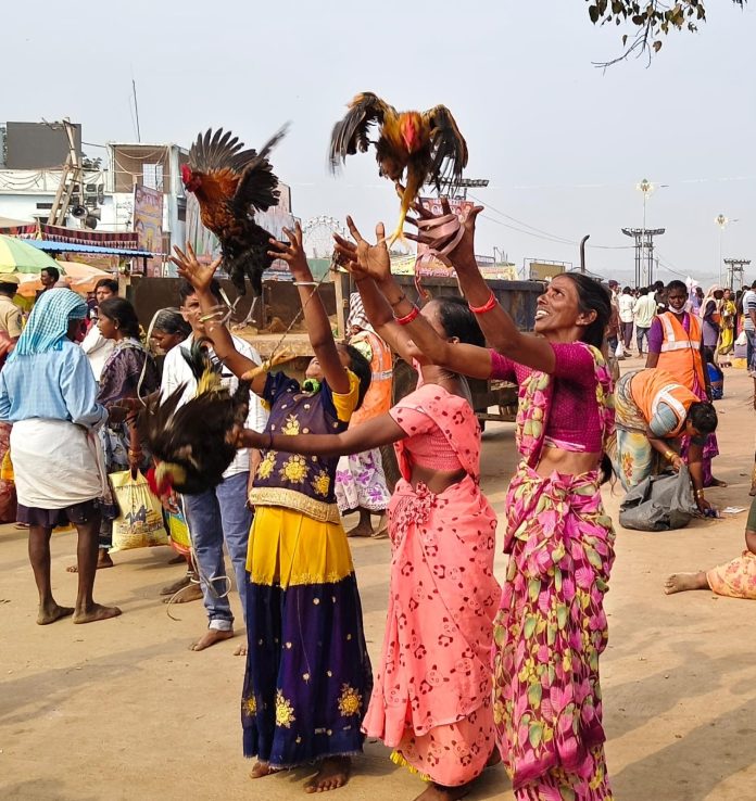 కాక‌తీయ‌, మేడారం బృందం : మేడారం సమ్మక్క–సారలమ్మ మహాజాతరలో నాటుకోళ్ల ‘ఎదురుకోళ్ల’ మొక్కులు అత్యంత విశిష్టమైన ఆదివాసీ సంప్రదాయంగా నిలుస్తున్నాయి. వనదేవతలు గద్దెలపైకి వచ్చే వేళ భక్తులు తమ భక్తిని చాటుకునే ఈ ఆచారం మేడారం జాతరకు ప్రత్యేక ఆకర్షణగా మారింది. సారలమ్మ, సమ్మక్క తల్లులు గద్దెపైకి చేరుకునే క్షణాల్లో వేలాది మంది భక్తులు నాటుకోళ్లతో గద్దెల వైపు పరుగులు తీస్తూ ఎదురుకోళ్లు ఇస్తూ మొక్కులు తీర్చుకుంటున్నారు. ఎదురుకోళ్ల మొక్కు గిరిజన సంస్కృతిలో శతాబ్దాలుగా కొనసాగుతున్న సంప్రదాయం. గద్దెల వద్ద నాటుకోళ్లను బలి ఇచ్చి, వాటితో వండిన మాంసాన్ని అమ్మవార్లకు నైవేద్యంగా సమర్పించడం ఆనవాయితీ. ఈ మొక్కు ద్వారా తమ కష్టాలు తొలగిపోతాయని, పంటలు బాగా పండుతాయని, కుటుంబానికి ఆయురారోగ్యాలు కలుగుతాయని భక్తుల ప్రగాఢ విశ్వాసం. ముఖ్యంగా గిరిజన కుటుంబాలు తరతరాలుగా ఈ సంప్రదాయాన్ని అచంచలంగా కొనసాగిస్తున్నాయి.