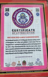 కాకతీయ, ఏలూరు ప్రతినిధి : కామవరపుకోట చరిత్రను ప్రతిబింబిస్తూ రచించిన “మా ఊరి తంగేడు పూలు” పుస్తకం తనకు విశేష గుర్తింపు తీసుకొచ్చిందని ప్రముఖ రచయిత్రి కొంకేపూడి అనురాధ తెలిపారు. ఈ రచనకు ఇటీవల తెలుగు బుక్ ఆఫ్ రికార్డులో స్థానం దక్కడం ఎంతో గర్వంగా ఉందని ఆమె ఆనందం వ్యక్తం చేశారు. తాను పుట్టిన ఊరి చరిత్రను గ్రంథరూపంలో తీసుకురావడానికి గ్రామస్తులు అందించిన సహకారం మరువలేనిదని, ప్రోత్సహించిన తన భర్త ప్రసాద్కు ప్రత్యేక కృతజ్ఞతలు తెలిపారు. విజయనగరంలో అనురాధను సహాయ ఫౌండేషన్ ట్రస్ట్ చైర్మన్ వీరమల్ల మధు కుటుంబ సభ్యులు మర్యాదపూర్వకంగా కలిసి అభినందనలు తెలిపారు. అనురాధ ఇప్పటికే పండగ పాటలు, మహతి కవితా సంపుటి, నిత్యమల్లె కథాసంపుటి, శాకాంబరీ ప్రసాదం వంటలు వంటి అనేక రచనలు చేశారు. ఆధ్యాత్మిక, సాంస్కృతిక రచనల ద్వారా సమాజాన్ని చైతన్యపరచడమే తన లక్ష్యమని ఆమె పేర్కొన్నారు.