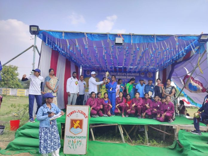 కాకతీయ,తుంగతుర్తి : సూర్యపేట జిల్లా తుంగతుర్తి మండల కేంద్రంలోని సామాజిక సంక్షేమ గురుకుల పాఠశాలలో జరిగిన 11వ జోనల్ స్పోర్ట్స్ మీట్ ముగిసింది. మూడు రోజుల పాటు జరిగిన ఈ క్రీడల్లో విద్యార్థులు తమ ప్రతిభను చాటుతూ ఉత్తేజభరితంగా పోటీ పడ్డారు. విభిన్న వయోపరిమితి విభాగాల్లో ఉత్కంఠభరిత పోటీలు జరగగా, పాలకుర్తి గురుకుల పాఠశాల విద్యార్థులు అద్భుత ప్రతిభ చూపి ఓవరాల్ చాంపియన్ కప్ను కైవసం చేసుకున్నారు. ఈ సందర్భంగా ఆ పాఠశాల విద్యార్థిని లావణ్య మాట్లాడుతూ, “జోనల్ స్థాయిలో గెలిచి ఛాంపియన్ టైటిల్ అందుకోవడం ఎంతో ఆనందంగా ఉందని. ఈ క్రీడలు మాకు స్నేహభావం, క్రమశిక్షణ, స్ఫూర్తిని పెంపొందించాయని. కోకో, వాలీబాల్, కబడ్డీ వంటి ఆటల్లో మా టీమ్ శ్రమ ఫలించింది” అని అన్నారు.