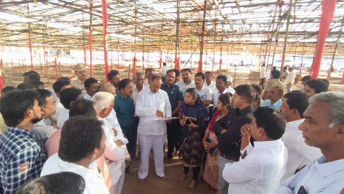 కాకతీయ, పరకాల: బుధవారం పరకాల పట్టణ కేంద్రంలోని శ్రీ కుంకుమేశ్వర స్వామి ఆలయ ప్రాంగణంలో నవంబర్ 17 న (సోమవారం) రోజు నిర్వహించనున్న మహా రుద్రయాగ ఏర్పాట్లను అధికారులతో కలిసి పరకాల ఎమ్మెల్యే రేవూరి ప్రకాశ్ రెడ్డి పరిశీలించారు.