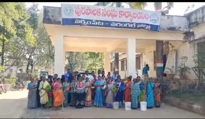 నర్సంపేట మున్సిపాలిటీ కార్యాలయం ఎదుట ఖాళీ బిందెలతో ధర్నా