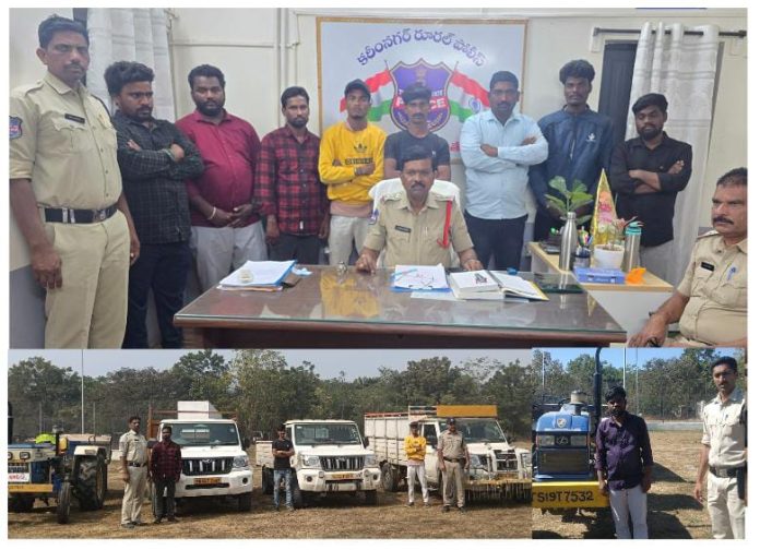 నగునూరు గ్రామానికి చెందిన కుంచం రఘు, కిసాన్నగర్కు చెందిన పండుగ అనిల్ అనుమతులు లేకుండా ట్రాక్టర్లలో ఇసుక తరలిస్తుండగా తీగలగుట్టపల్లి రైల్వే గేటు వద్ద పోలీసులు అడ్డుకుని పట్టుకున్నారు. అలాగే బొమ్మకల్ గ్రామానికి చెందిన కాశీపాక మహేష్, కాశీపాక శివకుమార్ ట్రాక్టర్లలో అక్రమంగా ఇసుక తరలిస్తుండగా బొమ్మకల్ గుంటూరుపల్లి స్టేజీ వద్ద అదుపులోకి తీసుకున్నారు. ఈ ఘటనలో మూడు బొలెరో వాహనాలు, మూడు ట్రాక్టర్లను పోలీసులు సీజ్ చేసి నిందితులపై కేసులు నమోదు చేశారు. అనంతరం వారిని కోర్టుకు తరలించారు. అలాగే తొమ్మిది మంది నిందితులను కరీంనగర్ రూరల్ ఎమ్మార్వో ముందు హాజరుపరచి ఒక్కొక్కరికి లక్ష రూపాయల చొప్పున పూచీకత్తుపై బైండోవర్ చేశారు. ఈ సందర్భంగా రూరల్ సీఐ నిరంజన్ రెడ్డి మాట్లాడుతూ అక్రమ ఇసుక రవాణాకు పాల్పడేవారిపై ఎలాంటి ఉపేక్ష ఉండదని, ఇలాంటి చర్యలు కొనసాగితే కఠిన చట్టపరమైన చర్యలు తప్పవని హెచ్చరించారు.