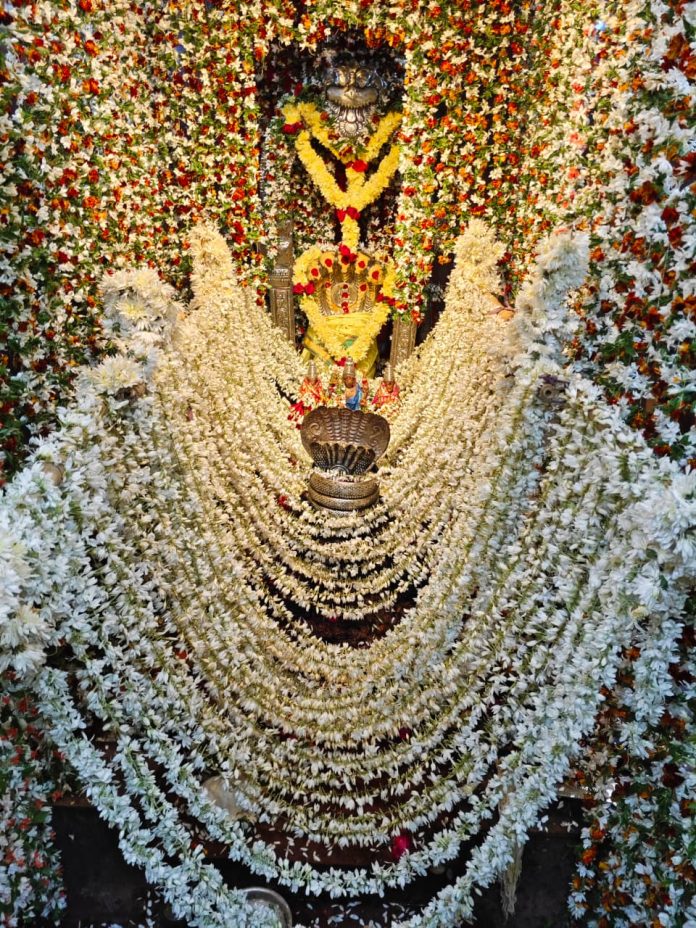 కాకతీయ, గీసుగొండ : మృగశిర మాసం చివరి మంగళవారాన్ని పురస్కరించుకొని మండలంలోని ఊకల్ హవేలీ గ్రామంలో కొలువుదీరిన శ్రీ వల్లిదేవసేన సమేత నాగ సుబ్రహ్మణ్యేశ్వర స్వామి దేవాలయంలో మంగళవారం విశేష పూజా కార్యక్రమాలు ఘనంగా నిర్వహించారు. ఆలయ ప్రధాన అర్చకులు సముద్రాల సుదర్శనాచార్యులు వైదిక మంత్రోచ్ఛారణల నడుమ స్వామివారికి ప్రత్యేక అభిషేకాలు, పూజలు నిర్వహించారు. అనంతరం స్వామివారిని మల్లెపూలతో ప్రత్యేకంగా అలంకరించారు. ఈ సందర్భంగా ఆలయం భక్తులతో కిటకిటలాడింది. జిల్లా నలుమూలల నుంచి భక్తులు భారీ సంఖ్యలో తరలివచ్చి స్వామివారి దర్శనం చేసుకుని మొక్కులు చెల్లించుకున్నారు. ఈ కార్యక్రమంలో ఆలయ ఉప అర్చకులు శ్రీహర్ష, ఆలయ కమిటీ చైర్మన్ తిమ్మాపురం రాజేశ్వరరావు, కోశాధికారి కొత్తగట్టు రాజేందర్, కమిటీ సభ్యులు పాల్గొన్నారు.