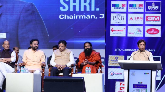 ప్రతి అంశాన్ని క్షుణ్నంగా పరిశీలించిన తర్వాతే నిర్ణయం తీసుకుంటన్నారన్నారు. ముఖ్యంగా వృద్ధి నైతికమైనదా, సమ్మిళితమైనదా, సుస్థిరమైనదా..? అని అధ్యయనం చేసిన తర్వాతే అడుగు ముందుకేస్తున్నారని మంత్రి అన్నారు. భవిష్యత్తు కోసం ఎదురు చూడకుండా, భవిష్యత్తునే తెలంగాణ నిర్మిస్తోందన్నారు. తెలంగాణ అవకాశాల ఖని అని, పరిశ్రమల ఏర్పాటుకు ఇతర రాష్ట్రాలతో పోలిస్తే అత్యంత అనుకూల పరిస్థితులున్నాయని వివరించారు. జైన సమాజం ‘సేవా’ స్ఫూర్తిని, తెలంగాణ ఇన్నోవేషన్ ఎకో సిస్టమ్ తో అనుసంధానిస్తే ప్రపంచం కోరుకుంటున్న నైతిక వృద్ధి నమూనా ఆవిష్కృతమవుతుందన్నారు. నిజమైన యూనికార్న్ అంటే బిలియన్ డాలర్ల విలువ కాదని, లక్షలాది మంది జీవితాలను ప్రభావితం చేయడమని యువ పారిశ్రామికవేత్తలు, ఆవిష్కర్తలకు సూచించారు. కార్యక్రమంలో ప్రముఖ యోగా గురువు రాందేవ్ బాబా, బీజేపీ రాష్ట్ర అధ్యక్షుడు రామచందర్ రావు, జీటో హైదరాబాద్ ఛాప్టర్ ప్రతినిధులు రోహిత్ కొఠారి, లలిత్ చోప్రా, విశాల్ అంచాలియా, బీఎల్ భండారీ, సుశీల్ తదితరులు పాల్గొన్నారు.