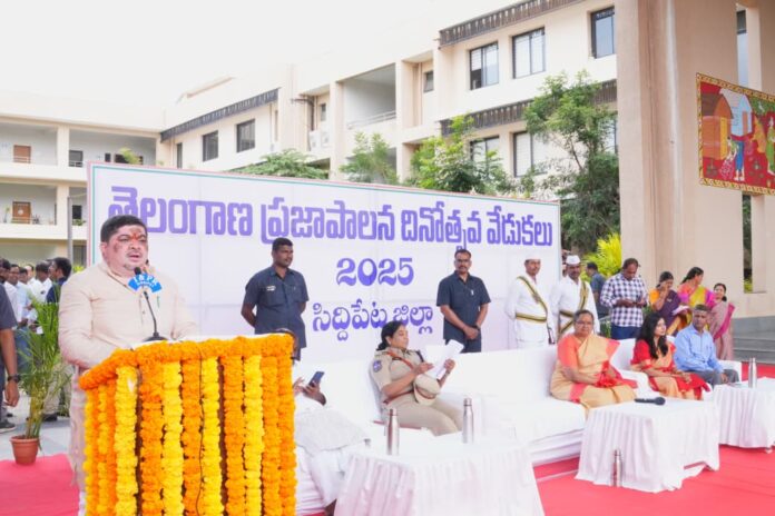 ప్రతి నియోజకవర్గానికి 3,500 ఇందిరమ్మ గృహాలను మంజూరు చేసినట్లు వెల్లడించారు. భూ సంస్కరణల కోసం భూ భారతి కార్యక్రమం ప్రారంభించి, గ్రామ భూ పరిపాలన అధికారులను నియమించామని తెలిపారు. చాకలి ఐలమ్మతో పాటు తొలి తరం, మలితరం ఉద్యమకారులను స్మరించిన మంత్రి, పెండింగ్లో ఉన్న అమర వీరుల స్థూపాన్ని పూర్తి చేస్తామని హామీ ఇచ్చారు. ప్రభుత్వ పాఠశాలలను బలోపేతం చేయాలని ముఖ్యమంత్రి సూచించారని మంత్రి తెలిపారు. ప్రతి ప్రభుత్వ ఉద్యోగి ఒక మొక్క నాటడంలో సిద్దిపేట జిల్లా రాష్ట్రంలో ప్రథమ స్థానంలో నిలిచిందని మంత్రి అభినందించారు.