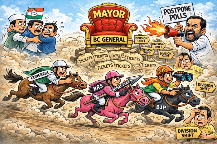 తాజా రిజర్వేషన్ జాబితాతో కరీంనగర్ మేయర్ పదవి బీసీ జనరల్కు కేటాయించబడటం నగర రాజకీయ గేమ్ను పూర్తిగా మార్చేసింది. కార్పొరేషన్లో ఎన్ని డివిజన్లు గెలిచినా చివరికి మేయర్ పీఠం ఎవరి చేతిలో పడుతుందన్నదే ఇప్పుడు అసలు రాజకీయ లక్ష్యంగా మారింది. దీంతో కాంగ్రెస్, బీఆర్ఎస్, బీజేపీలు తమ వ్యూహాలను మేయర్ పీఠం చుట్టూనే కేంద్రీకరించాయి. బీసీ జనరల్కు కేటాయించిన డివిజన్లు ఒక్కసారిగా హాట్సీట్లుగా మారి, ఇక్కడి నుంచే మేయర్ అభ్యర్థి వచ్చే అవకాశాలపై చర్చ జోరందుకుంది. అధికారంలో ఉన్న కాంగ్రెస్ పార్టీలో తాజా రిజర్వేషన్లతో అంతర్గత సమన్వయ లోపాలు బయటపడుతున్నాయి. నగరంలో వేర్వేరు నేతలు వేర్వేరు దారుల్లో నడుస్తుండటంతో టికెట్ల హామీలు, చేరికలు గందరగోళానికి దారితీస్తున్నాయన్న విమర్శలు వినిపిస్తున్నాయి. ఈ నేపథ్యంలో మున్సిపల్ ఎన్నికల ఇన్చార్జిగా మంత్రి *తుమ్మల నాగేశ్వరరావు*ను నియమించడం కీలకంగా మారింది. నగర నేతల మధ్య సమన్వయం సాధించి నిజమైన గెలుపు గుర్రాలను ఎంపిక చేయడం ఆయన ముందున్న పెద్ద సవాల్గా పార్టీ వర్గాలు భావిస్తున్నాయి.