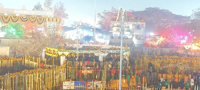 కాకతీయ, మేడారం బృందం : మేడారం మహాజాతరలో అత్యంత ఉత్కంఠభరితమైన ఘట్టం ఆవిష్కృతమైంది. చిలుకల గుట్టను విడిచి సంప్రదాయబద్ధంగా జనంలోకి వచ్చిన సమ్మక్క తల్లి చివరకు గద్దెపైకి చేరుకోవడంతో భక్తులు పారవశ్యంతో పరవశించి పోయారు. ఈ పవిత్ర క్షణాన్ని కళ్లారా వీక్షించేందుకు లక్షలాది మంది భక్తులు తరలివచ్చారు. అడుగడుగునా “జయ జయ సమ్మక్క” నామస్మరణతో వనం దద్దరిల్లింది. చిలుకల గుట్ట వద్ద సంప్రదాయ పూజల అనంతరం పూజారులు కుంకుమ భరిణె రూపంలో సమ్మక్క తల్లిని తీసుకువచ్చారు. మార్గమంతా శివసత్తుల పూనకాలు, డోలి మోతలు, కొమ్ము–బూరల నాదాలతో ఆధ్యాత్మిక వాతావరణం ఉప్పొంగింది. ఎదురుకోళ్లతో భక్తులు అమ్మవారికి ఘన స్వాగతం పలికారు. గద్దె ప్రాంతానికి చేరుకున్న వేళ భక్తుల హర్షాతిరేకాలు తారస్థాయికి చేరాయి. గద్దెపై సమ్మక్క తల్లి ప్రతిష్ఠతో జాతరలోని ప్రధాన పూజా కార్యక్రమాలు అధికారికంగా ప్రారంభమైనట్లయ్యింది. భక్తులు మొక్కులు చెల్లించుకుంటూ, బంగారం (బెల్లం) సమర్పిస్తూ అమ్మవారిని శరణు కోరారు. “మంచిగా జూస్తే మళ్లీ జాతరకు వస్తాం” అంటూ భక్తులు తమ కోర్కెలను అమ్మవారి సన్నిధిలో చెప్పుకున్నారు. ఇక సారలమ్మతో కలిసి తల్లీబిడ్డల దర్శనం కోసం భక్తజనం ఉత్కంఠగా ఎదురుచూస్తోంది.