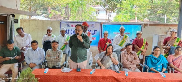 కాకతీయ, కొత్తగూడెం : కోర్టుల్లో ఏళ్ల తరబడి పెండింగ్లో ఉన్న కేసులను పరిష్కరించుకోవడానికి లోక్ అదాలత్ ఒక అద్భుతమైన వేదిక అని జిల్లా ప్రధాన న్యాయమూర్తి పాటిల్ వసంత్ శనివారం పేర్కొన్నారు. భద్రాద్రి కొత్తగూడెం జిల్లాలోని జిల్లా కోర్టు ప్రాంగణంలో శనివారం జాతీయ లోక్ అదాలత్ సందర్భంగా ఏర్పాటు చేసిన న్యాయ అవగాహన కార్యక్రమంలో న్యాయమూర్తి మాట్లాడుతూ రాజీ మార్గమే రాజమార్గము అని రాజీమార్గంలో కేసులను పరిష్కరించుకోవడం ద్వారా ఇరుపక్షాలు స్నేహపూర్వక వాతావరణం లో తమ కేసులను పరిష్కరించుకొనుటకు సువర్ణ అవకాశమని తెలిపారు.సివిల్ కేసులు, కాంపౌండబుల్ క్రిమినల్ కేసులు, మైంటెనెన్సు కేసులు, బ్యాంక్ రికవరీ మోటార్ వాహన ప్రమాద బీమా కేసులను ఇరు వర్గాలు పరస్పర అంగీకారంతో రాజీ పడాలని సూచించారు. లోక్ అదాలత్ ద్వారా కేసు పరిష్కారమైతే కోర్టు ఫీజు తిరిగి చెల్లించబడుతుందని, దీనివల్ల సమయం డబ్బు రెండూ ఆదా అవుతాయని వివరించారు.