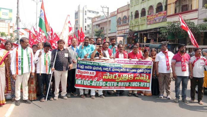 కాకతీయ, కొత్తగూడెం రూరల్ : కార్మిక హక్కుల సాధన కోసం, కార్మిక వ్యతిరేక నాలుగు లేబర్ కోడ్లను తక్షణమే రద్దు చేయాలని డిమాండ్ చేస్తూ కొత్తగూడెంలో కార్మిక వర్గం పెద్దఎత్తున కదిలింది. కార్మిక సంఘాల జాయింట్ యాక్షన్ కమిటీ ఆధ్వర్యంలో గురువారం భారీ ప్రదర్శన నిర్వహించి చుంచుపల్లి ఎమ్మార్వో కార్యాలయం ఎదుట ధర్నా చేపట్టారు. స్థానిక పోస్ట్ ఆఫీస్ సెంటర్ నుంచి ప్రారంభమైన ప్రదర్శన రామాలయం మీదుగా ఎమ్మార్వో కార్యాలయం వరకు కొనసాగింది. ఈ సందర్భంగా వివిధ కార్మిక సంఘాల నాయకులు పాల్గొని కేంద్ర ప్రభుత్వం అమలు చేయాలని చూస్తున్న నాలుగు లేబర్ కోడ్లు కార్మిక హక్కులను కాలరాస్తున్నాయని ఆరోపించారు. కార్మిక వ్యతిరేక విధానాలను వ్యతిరేకిస్తూ కార్మికులు, రైతులు ఐక్యంగా ఉద్యమించాల్సిన అవసరం ఉందని పిలుపునిచ్చారు.