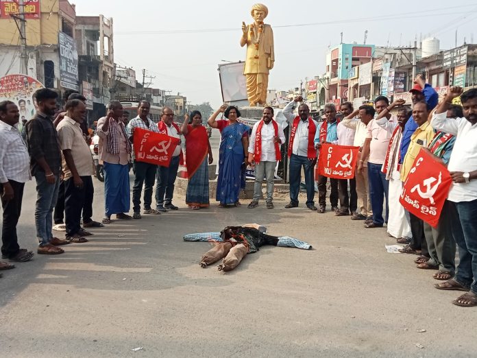 కాకతీయ, తుంగతుర్తి : అమెరికా అధ్యక్షుడు ట్రంప్ దురాహంకార వైఖరితో సాటి దేశమైన వెనుజువేలాపై అర్ధరాత్రి బాంబుల వర్షం కురిపిస్తూ దురాక్రమణకు పాల్పడటాన్ని యావత్ ప్రపంచ ప్రజలు తీవ్రంగా ఖండించాలని సీపీఐ (ఎం-ఎల్) మాస్ లైన్ సూర్యాపేట జిల్లా కార్యదర్శి కొత్తపల్లి శివకుమార్ పిలుపునిచ్చారు. ఈ మేరకు ఆదివారం తుంగతుర్తి నియోజకవర్గంలోని తిరుమలగిరి ఎక్స్‌రోడ్డు వద్ద ఉన్న జ్యోతిబాపూలే విగ్రహం సమీపంలో సీపీఐ (ఎం-ఎల్) మాస్ లైన్ తుంగతుర్తి డివిజన్ కమిటీ ఆధ్వర్యంలో అమెరికా దురాక్రమణను ఖండిస్తూ ట్రంప్ దిష్టిబొమ్మను దగ్ధం చేశారు. ఈ సందర్భంగా కొత్తపల్లి శివకుమార్ మాట్లాడుతూ… వెనుజువేలా దేశం తమ దేశంలోకి మత్తు పదార్థాలు రవాణా చేస్తోందన్న నెపంతో అమెరికా దాడి చేయడం పూర్తిగా అబద్ధమని విమర్శించారు. వాస్తవానికి వెనుజువేలాలో ఉన్న చమురు, బంగారం వంటి సహజ ఖనిజ సంపదలను దోచుకునేందుకే ట్రంప్ ఈ కుట్ర పన్నాడన్నారు. అభివృద్ధి చెందుతున్న దేశాల సహజ వనరులు, మానవ వనరులను కొల్లగొట్టడంలో అమెరికా అధ్యక్షుడు అందవేసిన చేయి అని ఆరోపించారు.